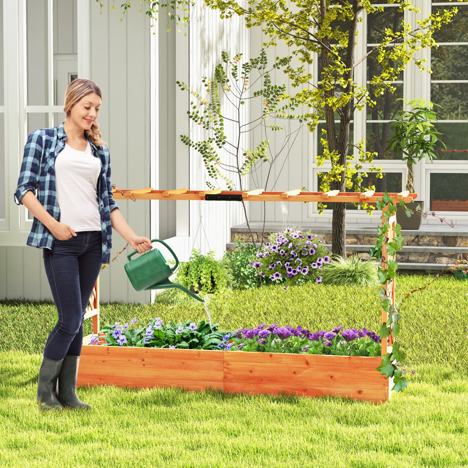 Costway 1 Pcs Raised Garden Bed With Trellis Hanging Roof Planter Box Drainage Holes For Patio