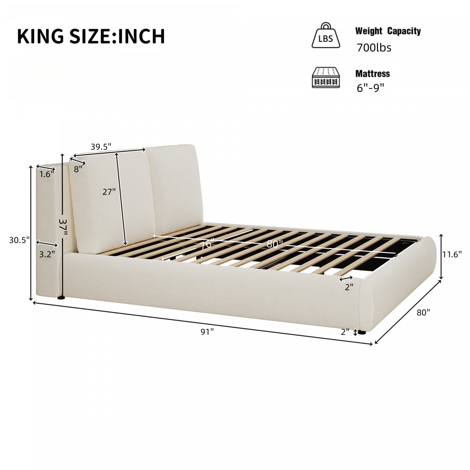 Aiden Platform Bed with Supportive Upholstered Frame in Boucle Fabric,King Size,White King Bed