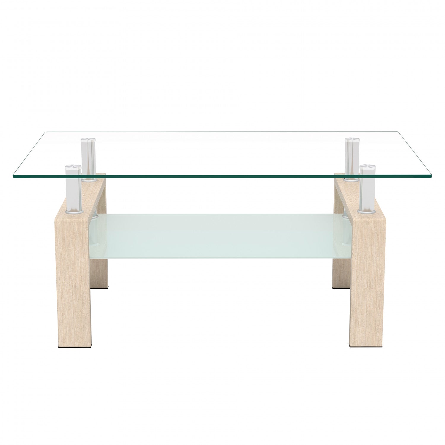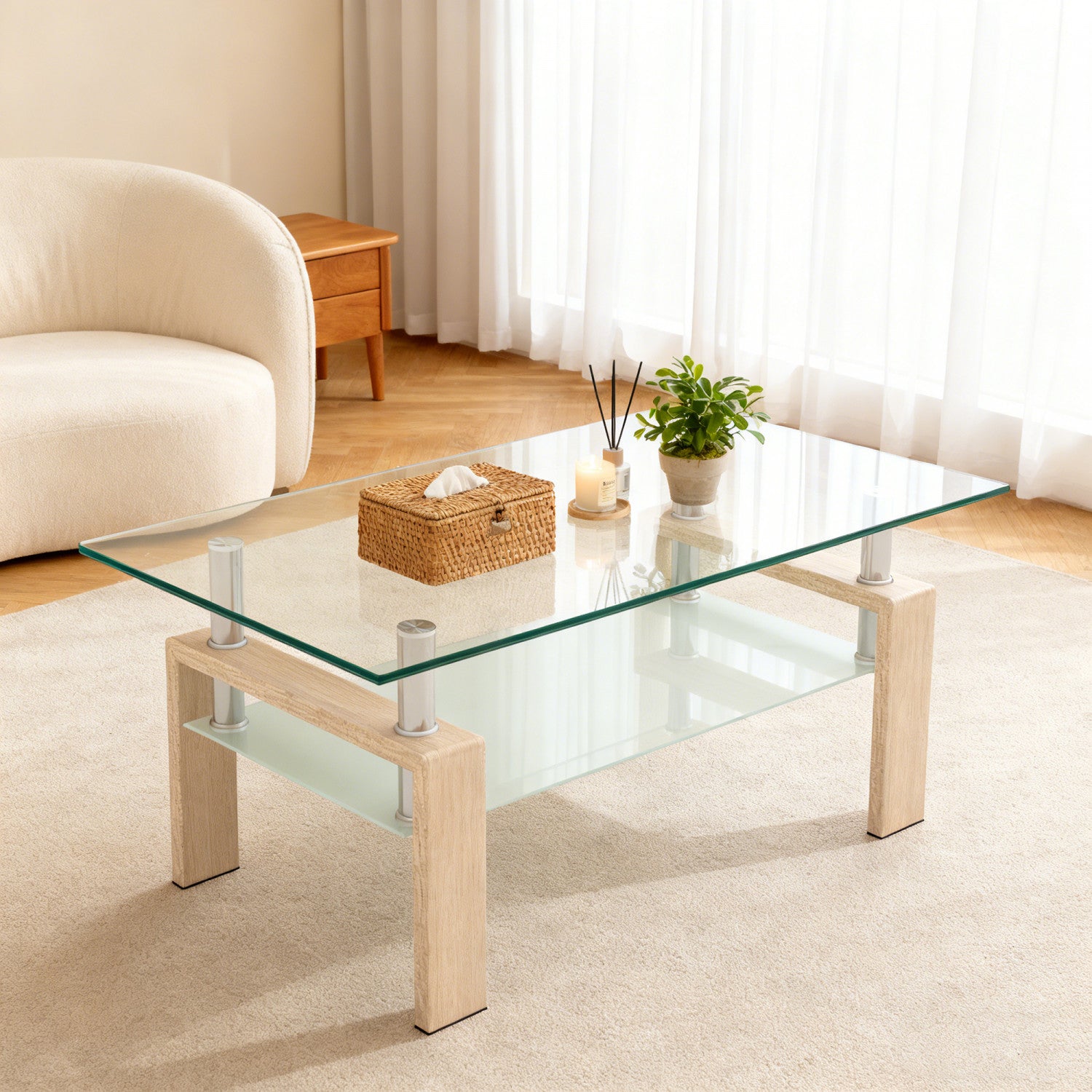 The Rectangle Glass Coffee Table brings modern elegance to your space with a clean tempered glass surface and stylish oak accents. Its spacious double-layer design offers ample storage, perfect for placing everyday items on the upper layer and books or magazines on the lower. The strong metal tube frame ensures durability while the glass surface is easy to clean. Ideal for living rooms, offices, or even as a makeup table, this versatile piece is a functional and aesthetic addition to any home.