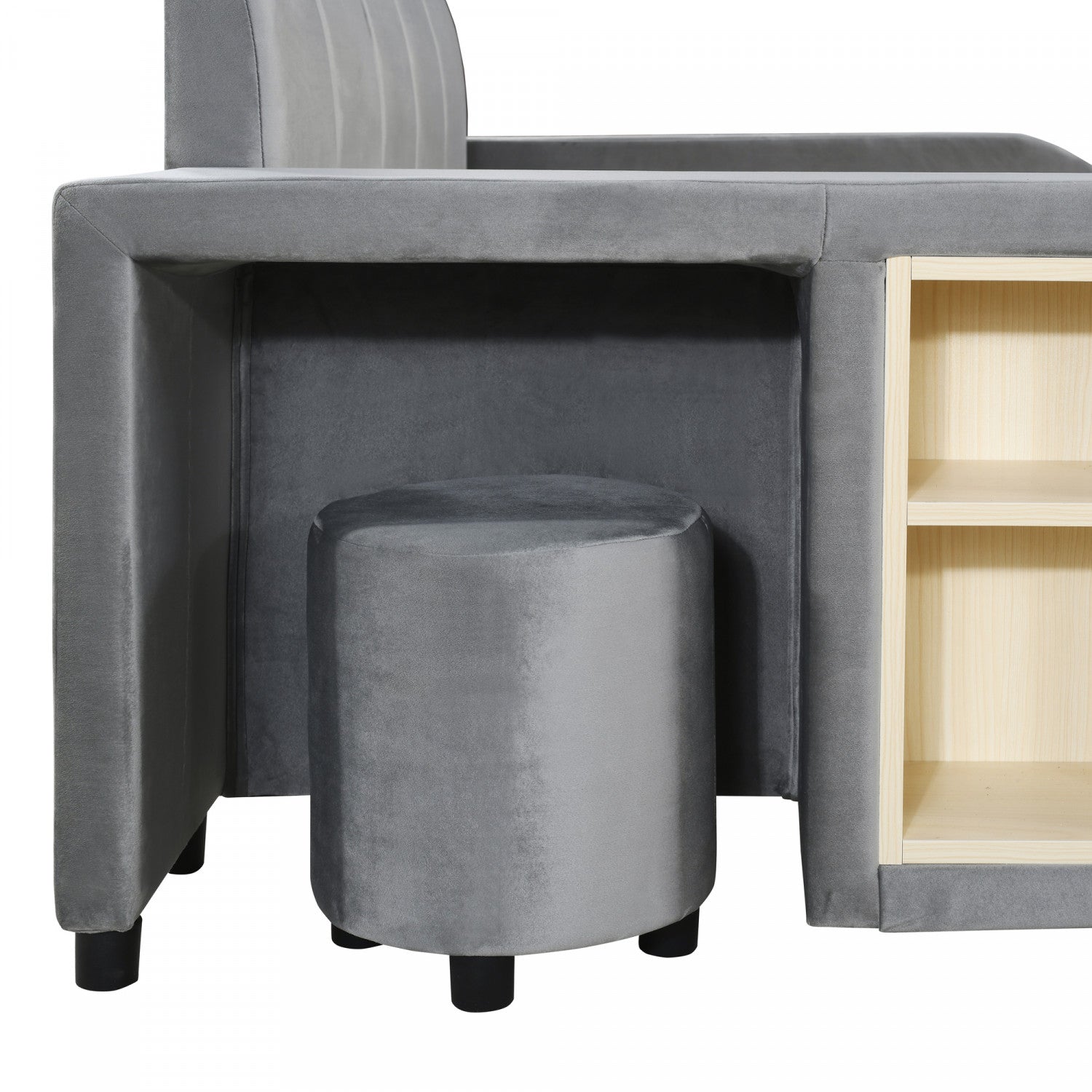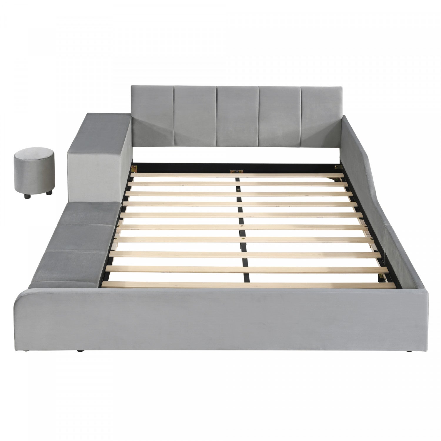 Lily Velvet Upholstered Grounded Bed with Desk and Stool,Queen Size,Grey Queen Bed