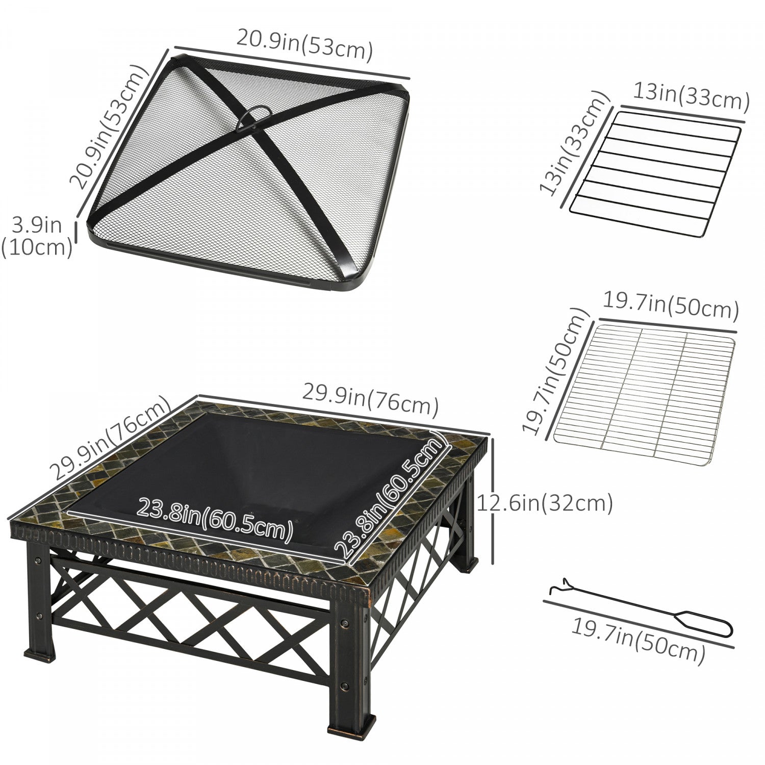 Outsunny 30" Outdoor Steel Square Firepit Square Stove With Spark Screen Cover, Log Grate, Poker, Grill Net For Patio