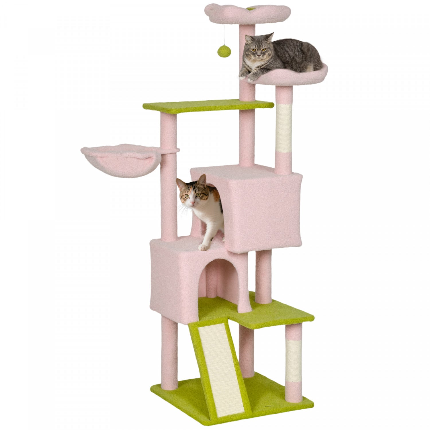 PawHut 62" Flower Cat Tree, Multi-Level Large Cat Tower with 2 Condos, 2 Beds, Hammock, Sisal Scratching Posts & Pad, Plush Perch, Platforms, for Indoor Kittens, Pink