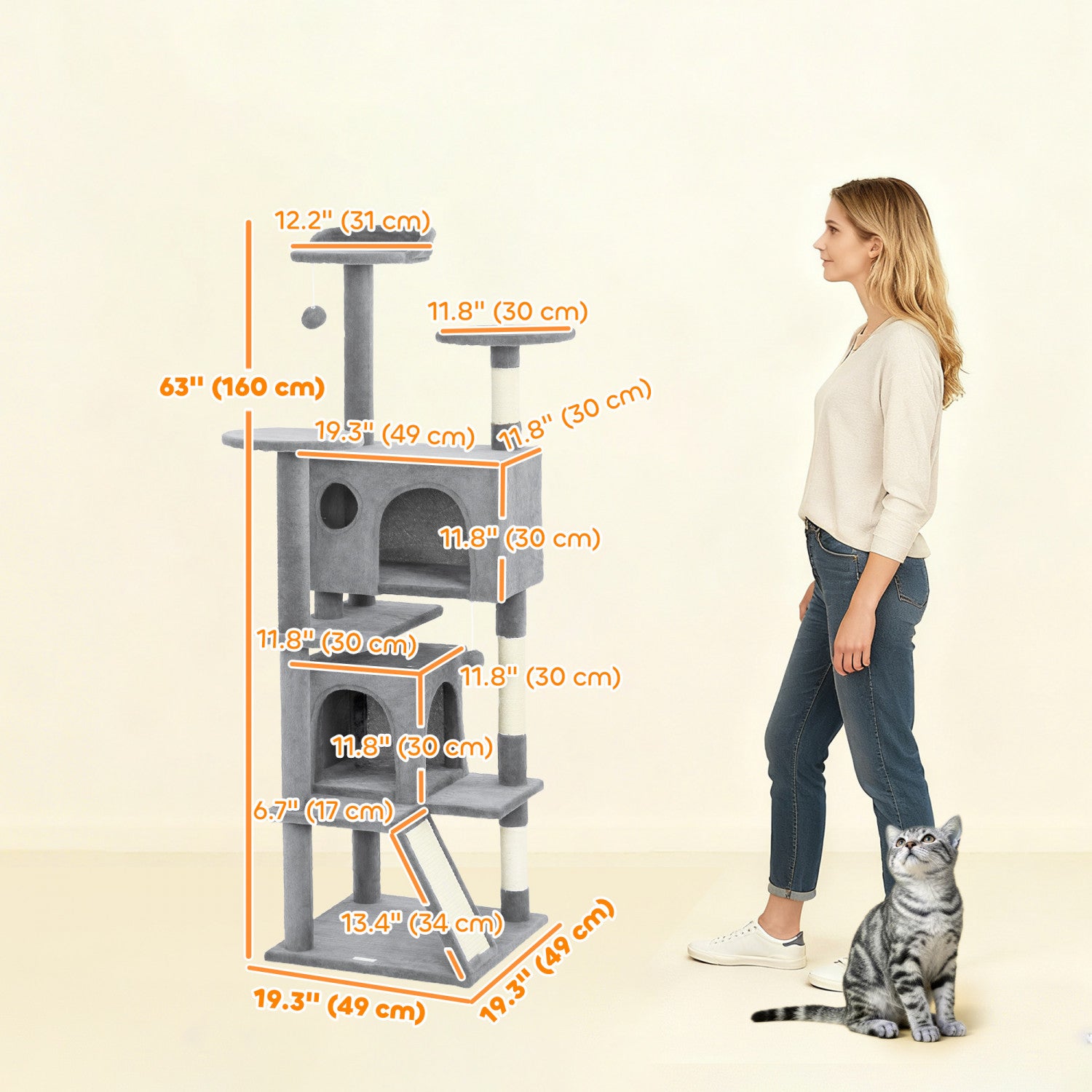 PawHut 63" Cat Tree, Cat Tower for Indoor Cats with Scratching Posts, Cat Condos, Bed, Platforms, Ramp, Toy Ball, Cat Activity Center, Light Grey