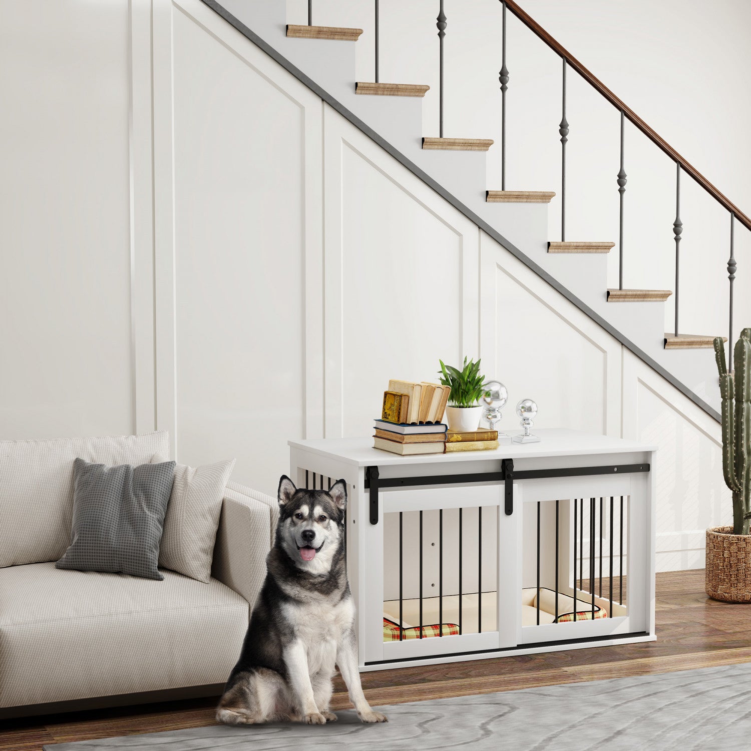 Pawhut Dog Crate Furniture, 39" Dog Crate End Table Indoor Dog House For Large Dogs, With Sliding Door, Lock, White
