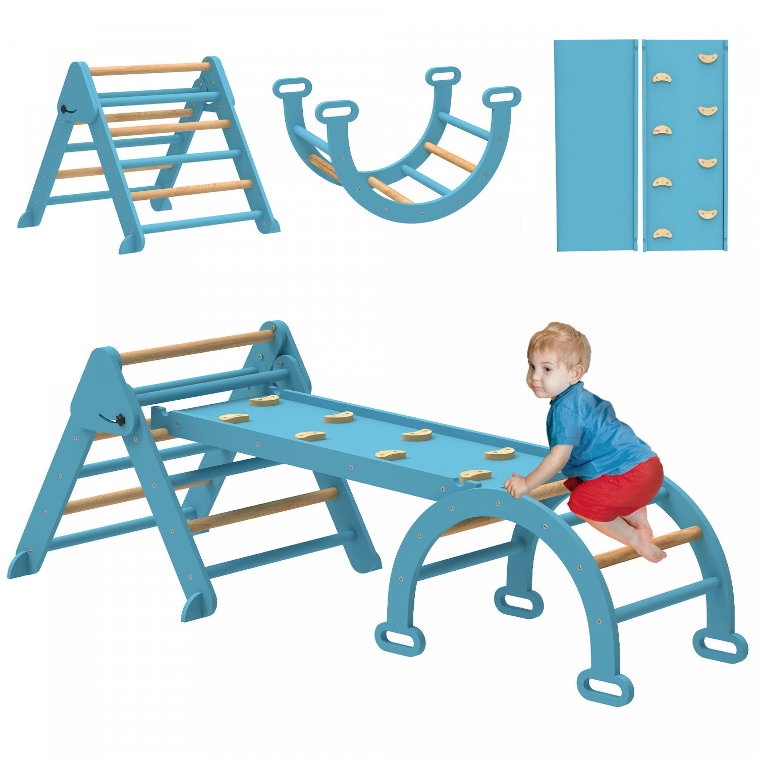 Qaba 7-in-1 Pikler Triangle Set, Foldable Wooden Climbing Toys with Arch, Ramp and Ladder, Montessori Indoor Playground Jungle Gyms for Toddlers 1-4 Years, Blue