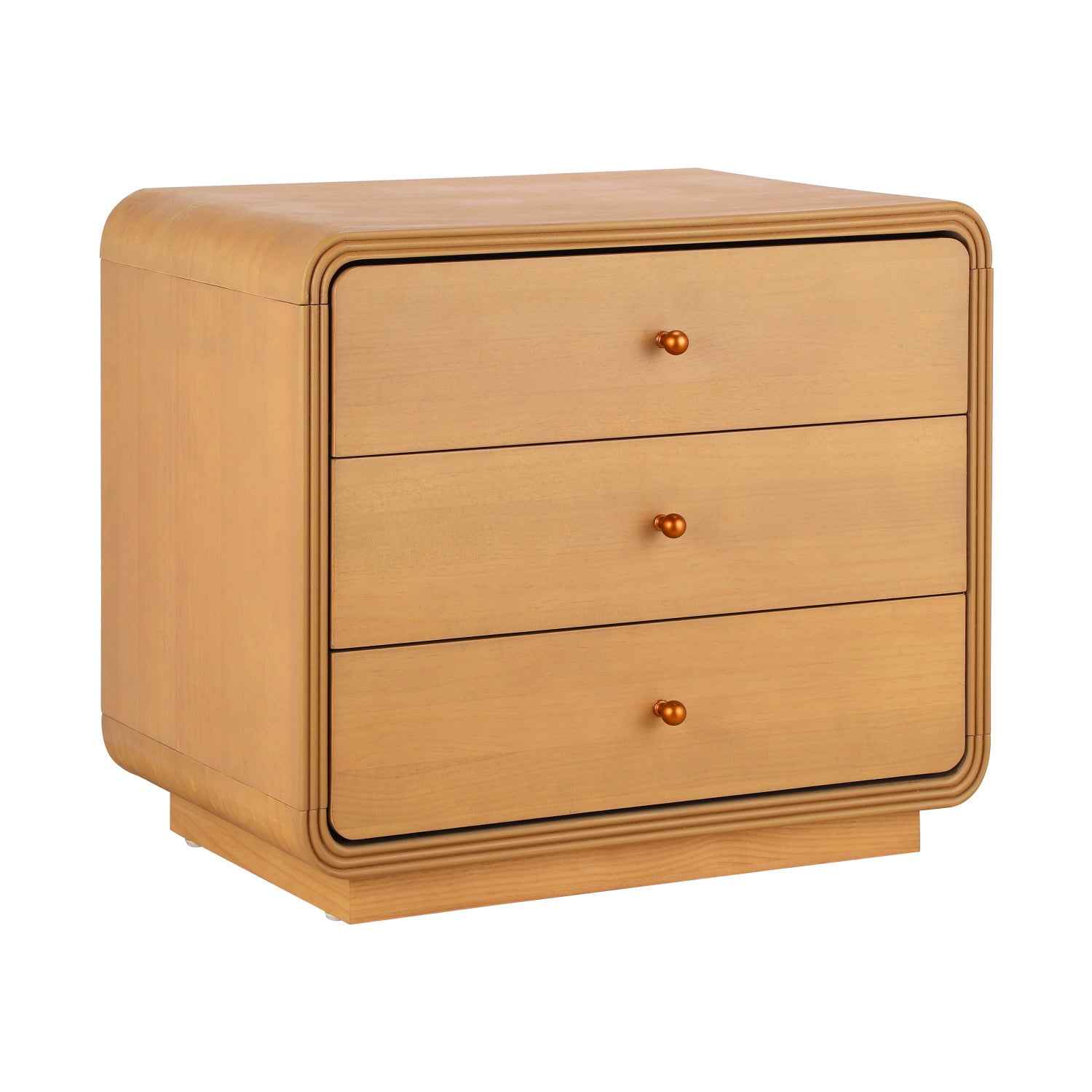 The 3-Drawer Nightstand brings a blend of fashion and function to your living space. Featuring a natural wood texture and delicate French brass pearl handles, this bedside table enhances any interior, from modern to vintage styles. With three spacious drawers and a top surface for essentials, it provides ample storage while maintaining a sleek look. The curved edges and heavy-duty base ensure safety, stability, and easy maintenance. Ideal for the bedroom or living room, this stylish nightstand adds both aesthetic appeal and practicality to your home.