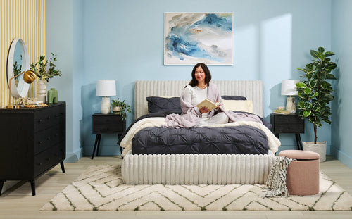 Playful tones and modern comfort blend in this fun, colourful bedroom.