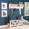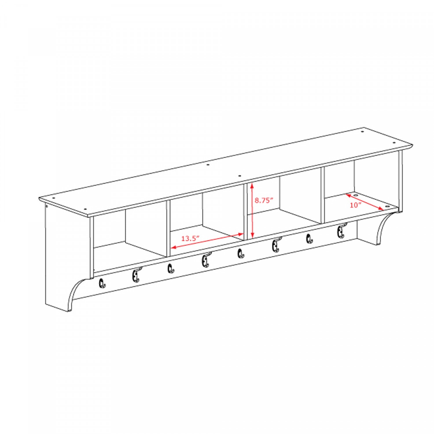 Ideal for an ever expanding household, the 60 in. Wide Hanging Entryway Shelf will keep your entryway belongings together in one place! Suitable for any front hallway, foyer or mudroom, the four compartments provide ample storage for everyone in your family. Fill with baskets, gloves, mittens, hats and books. Five large and four small hooks provide plenty of places to hang jackets, coats, hoodies, sweaters, bags and purses. Installs easily with our innovative hanging rail system.