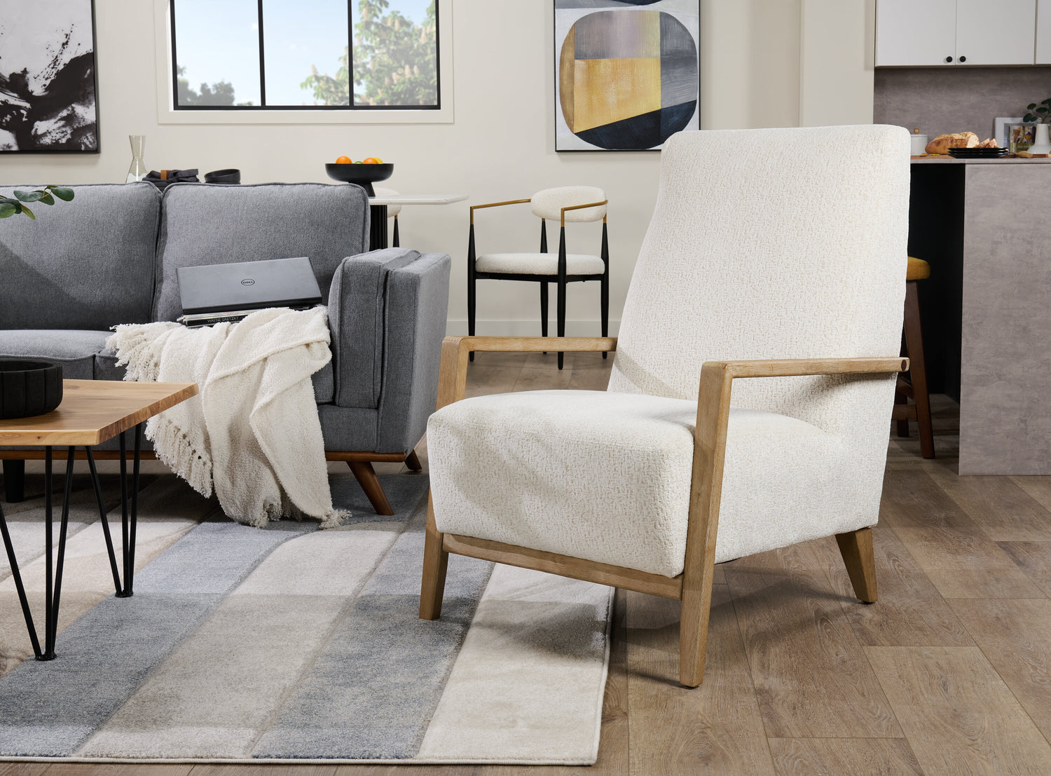 | Accent Details | Alabaster white upholstery blends well with the natural wood of the arms and legs. |