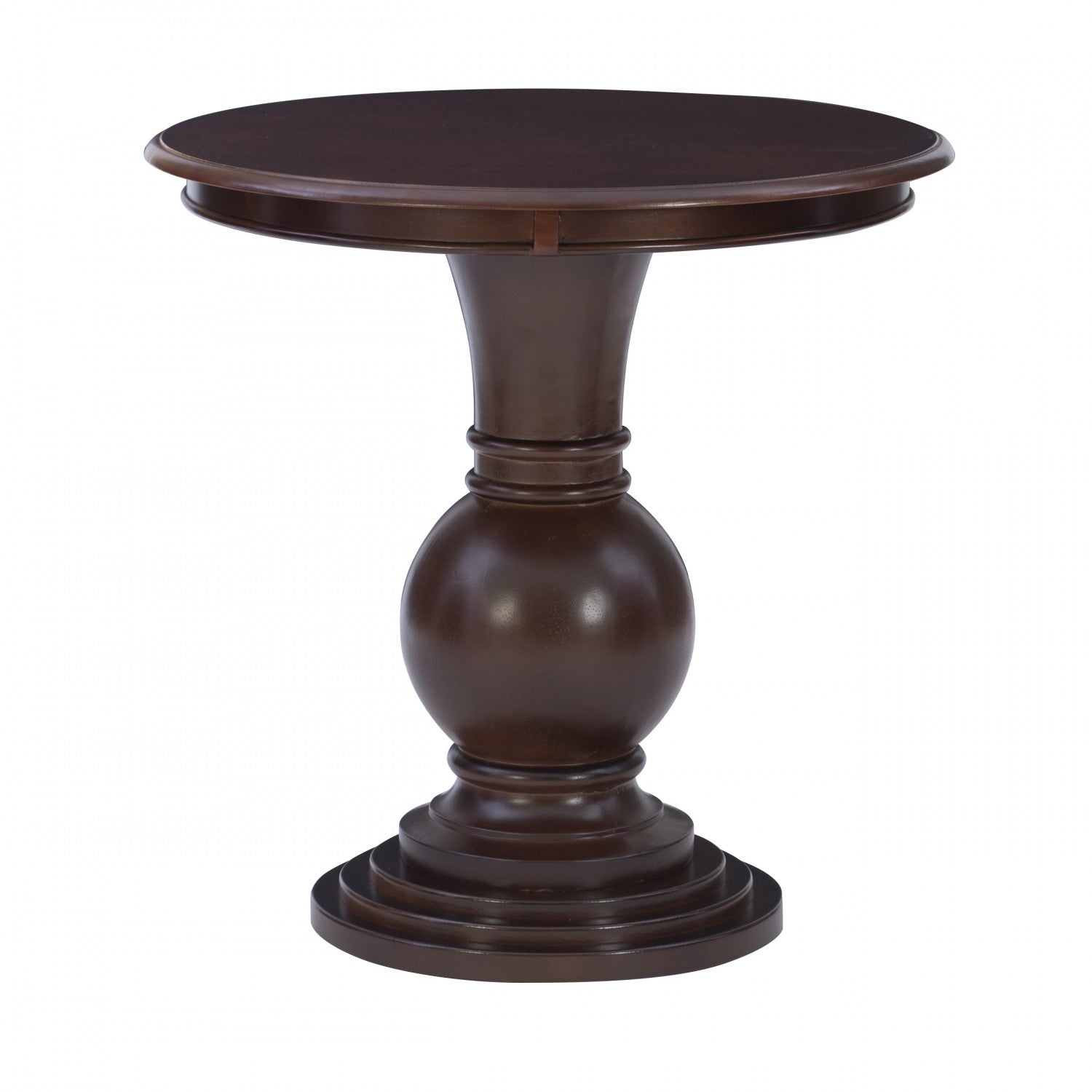 This contemporary espresso accent table is the perfect chairside table for any room. The table features a round pedestal base, made from select hardwood veneers and solid wood material, and has contemporary styling with a bentwood skirt. Some assembly required.