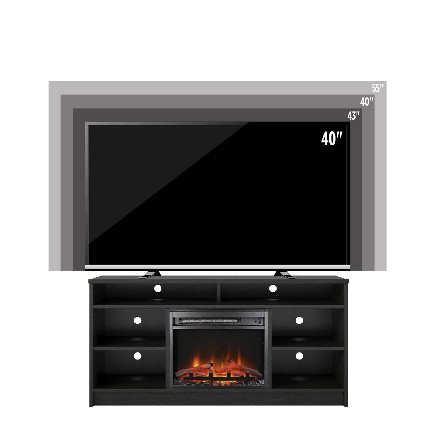 Dial in your perfect level of cozy, no matter the weather, with a 55" TV Stand with Electric Fireplace. The fireplace entertainment center has plenty of open storage. Six shelves with adjustable shelving keep your entertainment components organized with built-in wire management to keep cords tangle-free. The TV stand accommodates most 55" flat panel TVs with a maximum weight of 80 lbs. What makes it stand out is the integrated electric freestanding fireplace heater, bringing a natural warmth to your space. The lifelike LED flames, grate, and log set create a cozy atmosphere, while the tempered glass front enhances its contemporary look. Efficiently heating rooms up to 400 square feet, this fireplace heater is perfect for those cold nights. Enjoy the calming flames with or without heat, making it versatile for any season. The cool-touch front ensures safety for kids and pets. Assembly is straightforward with clearly labeled parts, and our customer support team is always ready to help. Plus, replacement fireplace inserts keep your furniture looking stunning for years. Made from engineered wood, this TV console with fireplace insert is both elegant and affordable.