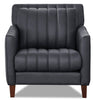 This Archer chair is handmade by skilled craftsmen using a kiln-dried solid wood frame. It is covered in soft, supple top-grain leather on all seating areas and armrests. The no-sag seat springs and individually wrapped pocket coils provide a balanced weight distribution for maximum durability and lasting comfort. The seat cushion has memory foam for added comfort and support. With fresh styling, the vertical channel seat and back design of the Archer create a simple yet elegant statement in your home. This chair is covered in stunning sueded leather dyed in midnight grey and is stain resistant, soft and easy to clean. Taking center stage, the Archer is sure to bring a touch of modern chic to your space.