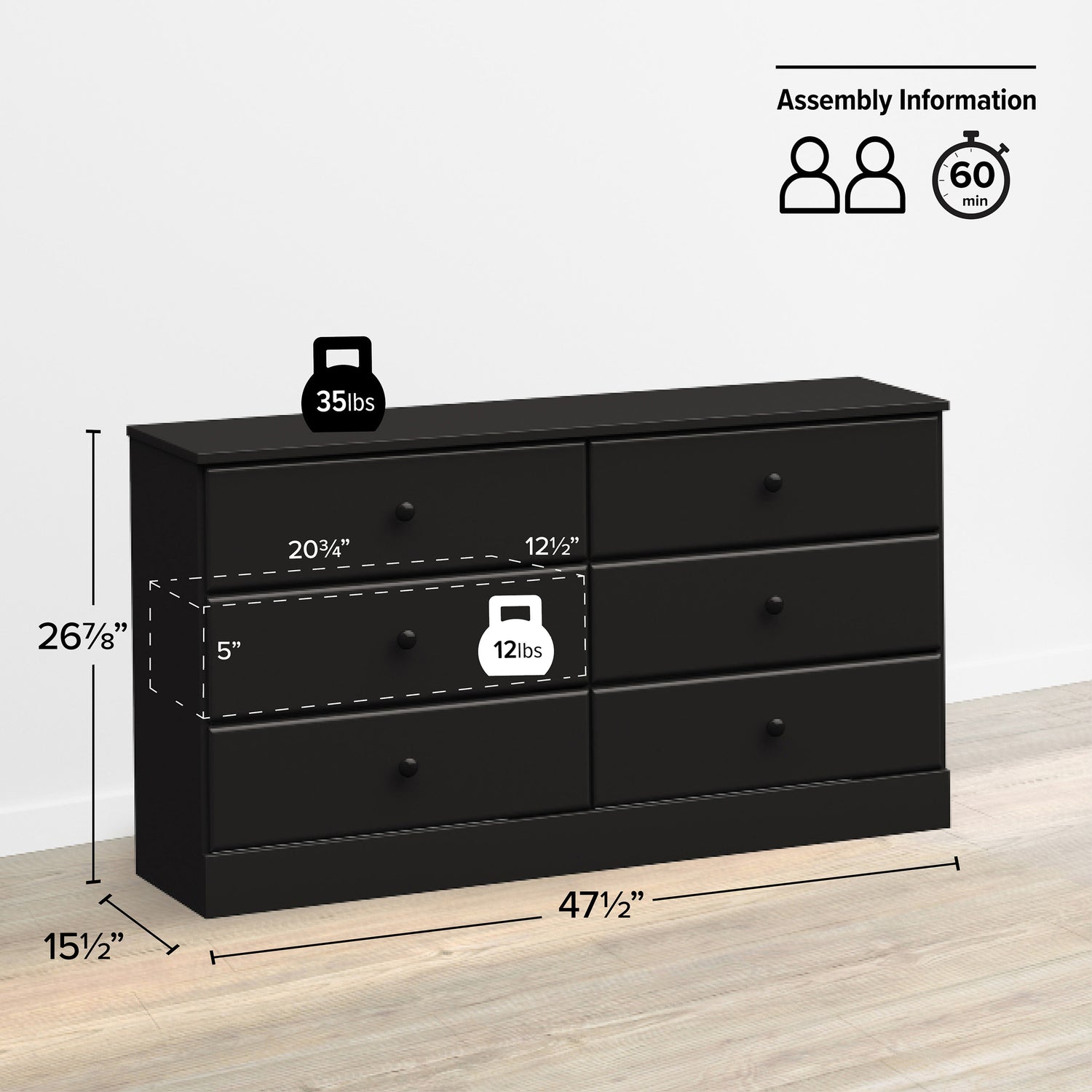 The Astrid 6-Drawer dresser has a contemporary design and clean lines that complements a variety of decors. Profiled drawer fronts and solid wood knobs help provide a timeless look. Use on its own or pair it with other matching pieces from the Astrid Collection. At 47.25 in. wide, this classic design gives you lots of room on top to showcase treasured items like jewelry boxes, lamps and photos.