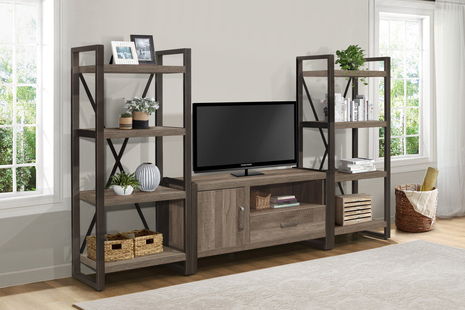 The contemporary styling of the on-trend Bassett 51" TV Stand features a handsome two-tone mixed-media finish. The gunmetal accenting on the stand's metal framing provides a distinct contrast to the printed brown faux wood grain melamine veneer. The premium melamine laminate is not only scratch and stain resistant but is also a breeze to clean. Providing plenty of storage for your media accessories, including a storage cubby, a side cabinet with an adjustable shelf, and a drawer with roller side glides, this modern TV stand brings style to your living room while minimizing clutter.