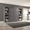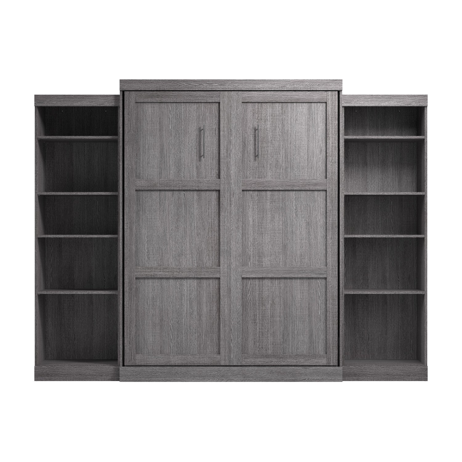 The Bestar Pur Queen Murphy Bed and 2 Shelving Units (115W) is the ideal space saver for a multipurpose room. The mattress support uses flexible slats that follow the curves of the body and absorb pressure for maximum comfort. The Queen Murphy bed can be used every night for a good night’s sleep. The bed folds up and down smoothly within seconds. The wall bed accommodates most standard Queen mattresses (8-12 inches thick, 60-90 lb, 60 x 80 inches) and supports up to 1000 lb (including mattress). The open bed extends 92 inches from the wall. The cabinet must be anchored to a wall with a minimum ceiling height of 91. 1 inches. Allow a clearance of 30-36 inches around the open bed. Both shelving units come with 2 fixed and 3 adjustable shelves to hold your belongings. The dual-mount wall bed mechanism attaches to the floor and wall for ease of assembly and maximum stability and durability. To avoid risk of injury, the Murphy bed must be installed to wall and floor structure by a professional or qualified person. Two people are required for assembly. Installation requires attachment to wood studs or masonry, removal of the baseboard, and drilling into the floor (if disassembly is required, holes may be covered with baseboards 0. 5 inches or thicker). All necessary hardware is included. Do not use this product for children or pets under 50 pounds (22. 7 kg). Backed by the Bestar 10 Year Manufacturer’s Warranty. North American made with globally sourced materials.