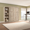 The Bestar Pur Queen Murphy Bed with Shelving Unit (90W) is the ideal space saver for a multipurpose room. The mattress support uses flexible slats that follow the curves of the body and absorb pressure for maximum comfort. The Queen Murphy bed can be used every night for a good night’s sleep. The bed folds up and down smoothly thanks to the dual piston system. The wall bed accommodates most standard Queen mattresses (8-12 inches thick, 60-90 lb, 60 x 80 inches) and supports up to 1000 lb (including mattress). The open bed extends 92 inches from the wall. The cabinet must be anchored to a wall with a minimum ceiling height of 91. 1 inches. Allow a clearance of 30-36 inches around the open bed. The shelving unit comes with 2 fixed and 3 adjustable shelves to hold your personal items. The dual-mount wall bed mechanism attaches to the floor and wall for maximum stability and durability. To avoid risk of injury, the Murphy bed must be installed to wall and floor structure by a professional or qualified person. Two people are required for assembly. Installation requires attachment to wood studs or masonry, removal of the baseboard, and drilling into the floor (if disassembly is required, holes may be covered with baseboards 0. 5 inches or thicker). All necessary hardware is included. Do not use this product for children or pets under 50 pounds (22. 7 kg). This bundle is backed by the Bestar 10 Year Manufacturer’s Warranty. North American made with globally sourced materials.