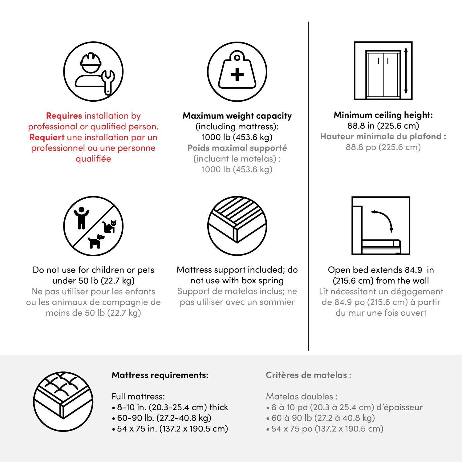 The Bestar Versatile Full Murphy Bed and Closet Organizer (84W) is the ideal space saver for a multipurpose room. The mattress support uses flexible slats that follow the curves of the body and absorb pressure for maximum comfort. The Full Murphy bed folds up and down smoothly thanks to the dual piston system. The wall bed can be used every night for a good night’s sleep. The bed accommodates most standard Full mattresses (8-10 inches thick, 60-90 lb, 54 x 75 inches) and supports up to 1000 lb (including mattress). The open bed extends 84. 9 inches from the wall. The cabinet must be anchored to a wall with a minimum ceiling height of 88. 8 inches. Allow a clearance of 30-36 inches around the open bed. Closet organizer comes with 2 fixed and 4 adjustable shelves to store your belongings. The dual-mount wall bed mechanism attaches to the floor and wall for maximum stability and durability. To avoid risk of injury, the Murphy bed must be installed to wall and floor structure by a professional or qualified person. Two people are required for assembly. Installation requires attachment to wood studs or masonry, removal of the baseboard, and drilling into the floor (if disassembly is required, holes may be covered with baseboards 0. 5 inches or thicker). All necessary hardware is included. Do not use this product for children or pets under 50 pounds (22. 7 kg). Backed by the Bestar 10 Year Manufacturer’s Warranty. North American made with globally sourced materials.