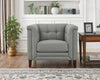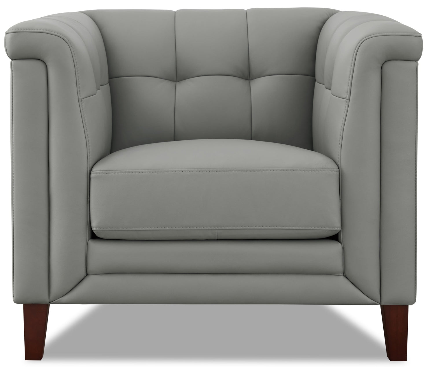 This Bodie chair is handmade by skilled craftsmen using a kiln-dried solid wood frame. It is covered in soft, supple top-grain leather on all seating areas and armrests. The no-sag seat springs and individually wrapped pocket coils provide a balanced weight distribution for maximum durability and lasting comfort. The seat cushion has memory foam for added comfort and support. The Bodie has a polished look that is sure to freshen up your room. The double cushion, shelter arm silhouette is accented by an understated tufted back which softens the overall design. The solid wood feet with a dark brown finish are exposed to add a tailored touch that completes the look.