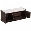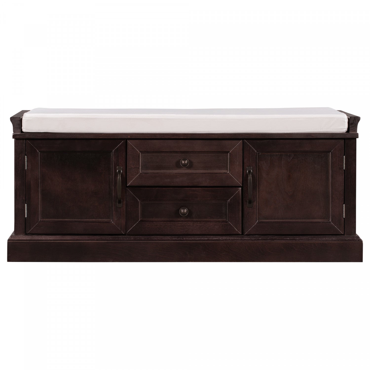 Keep your entryway organized with the storage bench, combining classic design with everyday functionality. This bench features four doors with adjustable shelves, perfect for storing shoes, books, or other essentials. Crafted from solid wood and mdf, it offers long-lasting durability. A removable 2. 2-inch velvet cushion provides comfort while sitting. Retro-style aluminum handles add a vintage touch, making this bench a stylish addition to your hallway, mudroom, or living room.