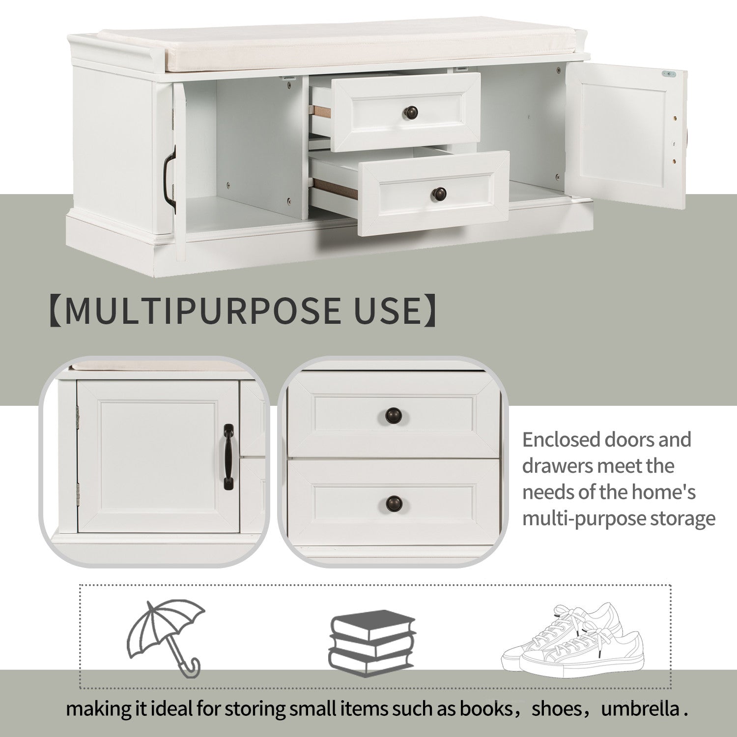 Keep your entryway organized with the storage bench, combining classic design with everyday functionality. This bench features four doors with adjustable shelves, perfect for storing shoes, books, or other essentials. Crafted from solid wood and mdf, it offers long-lasting durability. A removable 2. 2-inch velvet cushion provides comfort while sitting. Retro-style aluminum handles add a vintage touch, making this bench a stylish addition to your hallway, mudroom, or living room.