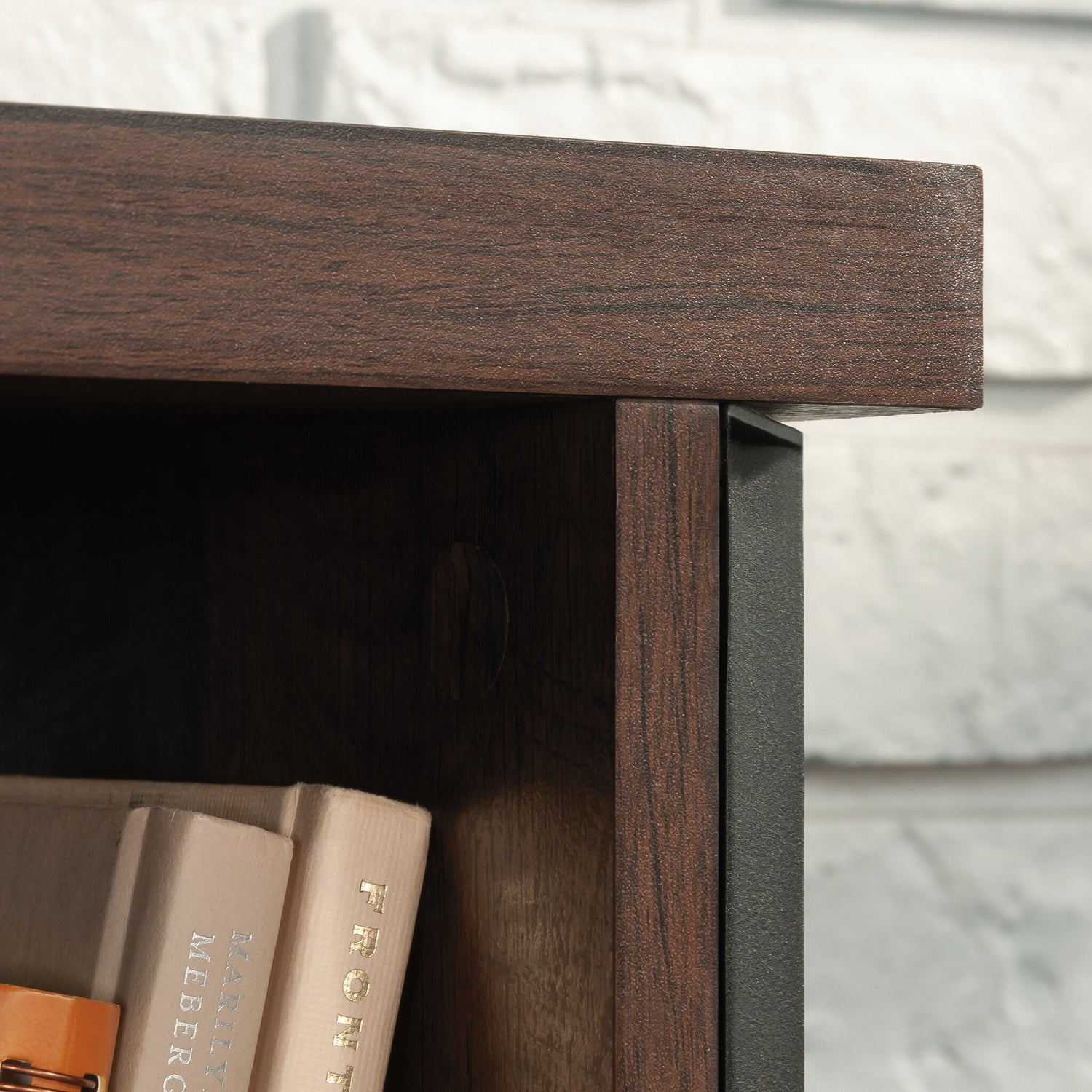 Create a stunning focal point while increasing the storage capabilities in your home with this Briarbrook large hutch. This piece features a hidden storage area behind its cabinet doors that is perfect for easy access to office essentials, while open areas with two adjustable shelves make it a great stop for home decor display. With a powder-coated metal frame for durability and design, your new storage unit will last for many years to come. Finished in a dark brown tone, this stylish hutch adds a unique element to any room in your home or office.