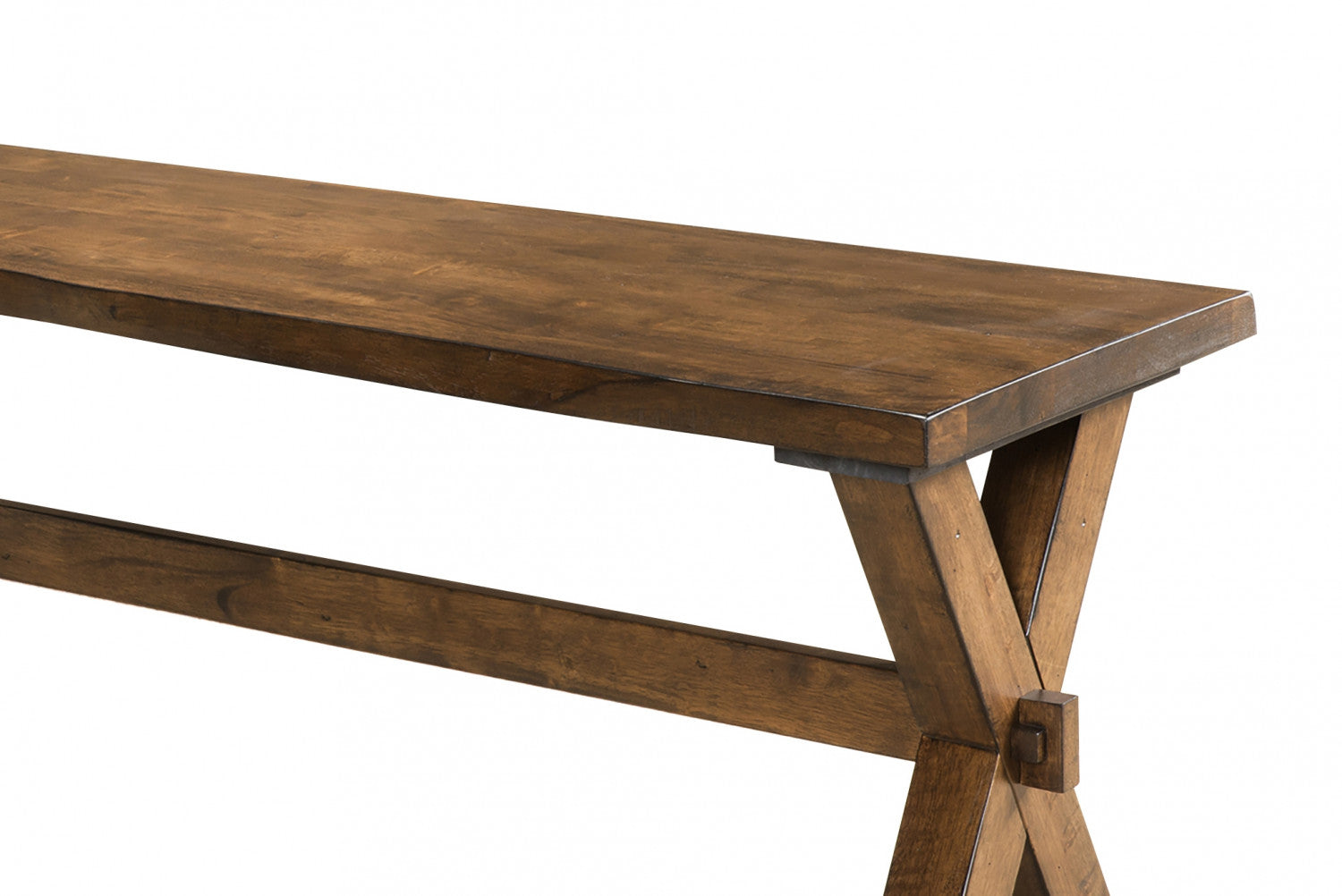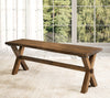 An old-world look with new-world craftsmanship, the Brienne Dining Bench is solid wood and features a single natural cut edge, giving you the weathered appeal of the reclaimed barn wood style but modernized with smooth edges and a warm burnished oak finish. A secure x-shaped base with an additional cross-brace ensures that this bench will be a sturdy cornerstone of your home for years to come. Evoking the warm and inviting presence of a cozy rustic cabin, the Brienne bench will have you relaxing like you're at the cottage in no time. Coordinating dining chairs are also available.