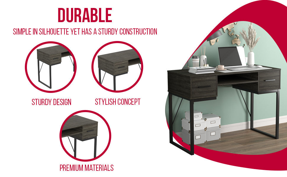 43” Computer Desk With 2 Drawers And 1 Shelf - Dark Grey With Black Metal Base