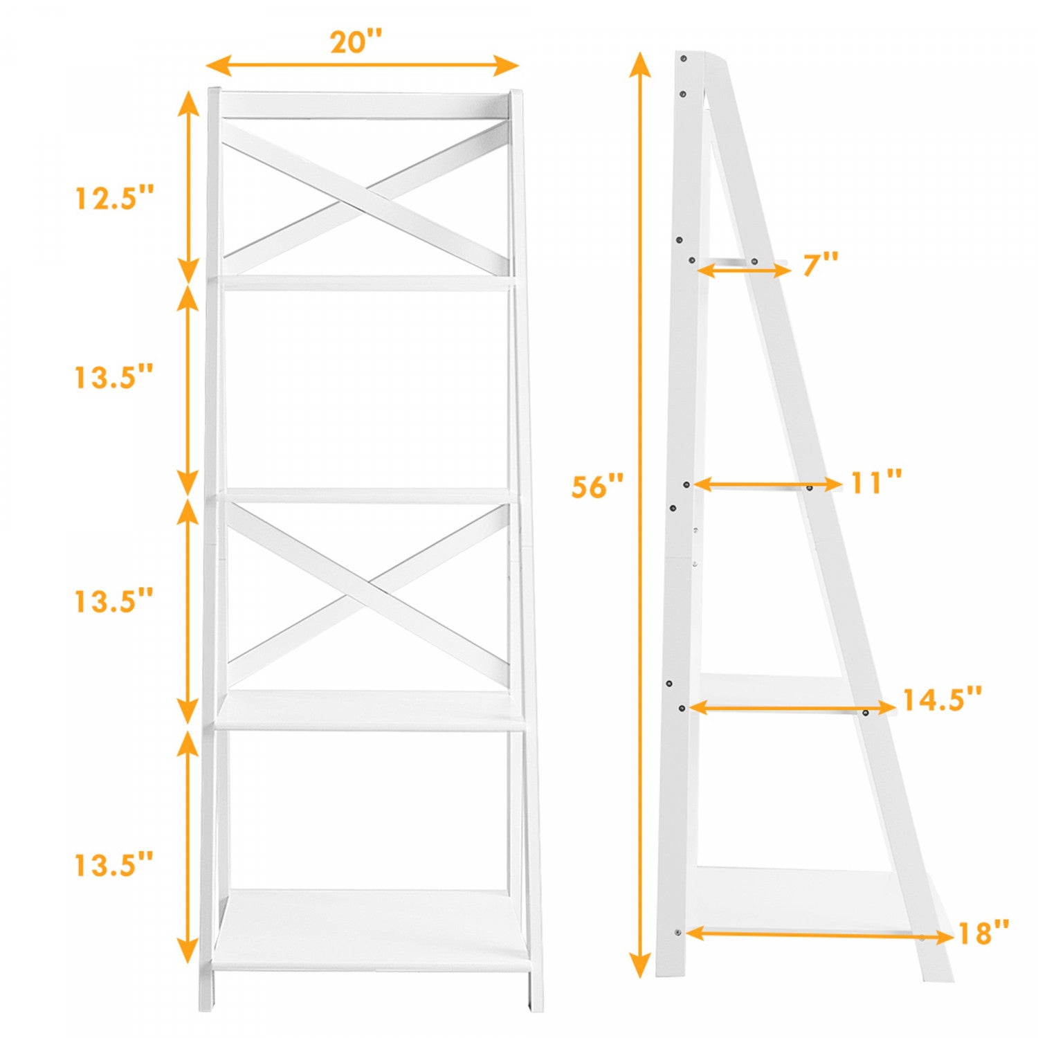 | Additional Information | Color: White Material: MDF Board Product Dimension: 20'' X 18'' X 56'' (L X W X H ) Net Weight: 23.5 lbs Bearing Capacity of each Shelf: 11 lbs Package Includes: 2 X Ladder Shelf 1 X User Guide |