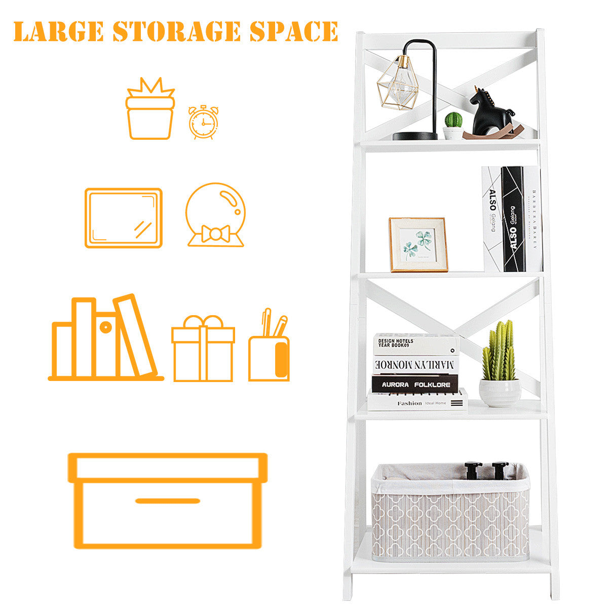 Want to say goodbye to your messy room. Not only does our 4-tier ladder shelf provide you with an efficient storage solution, but also adds a modern feeling for your home or office.