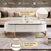 The 47. 2" oval coffee table adds modern elegance to any living room with its high-gloss white finish and gold lacquered base. Two spacious drawers keep your space clutter-free, while the curved profile and marble-look top elevate the design. Crafted from durable engineered wood and supported by a sturdy metal frame, this table is built for everyday functionality and timeless style. Perfect for contemporary, glam, or minimalist interiors.