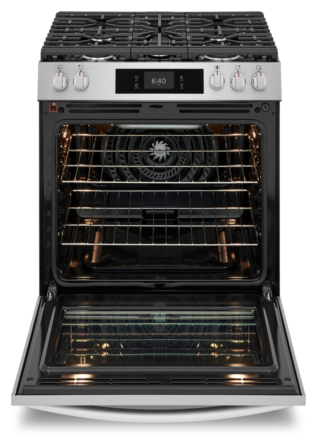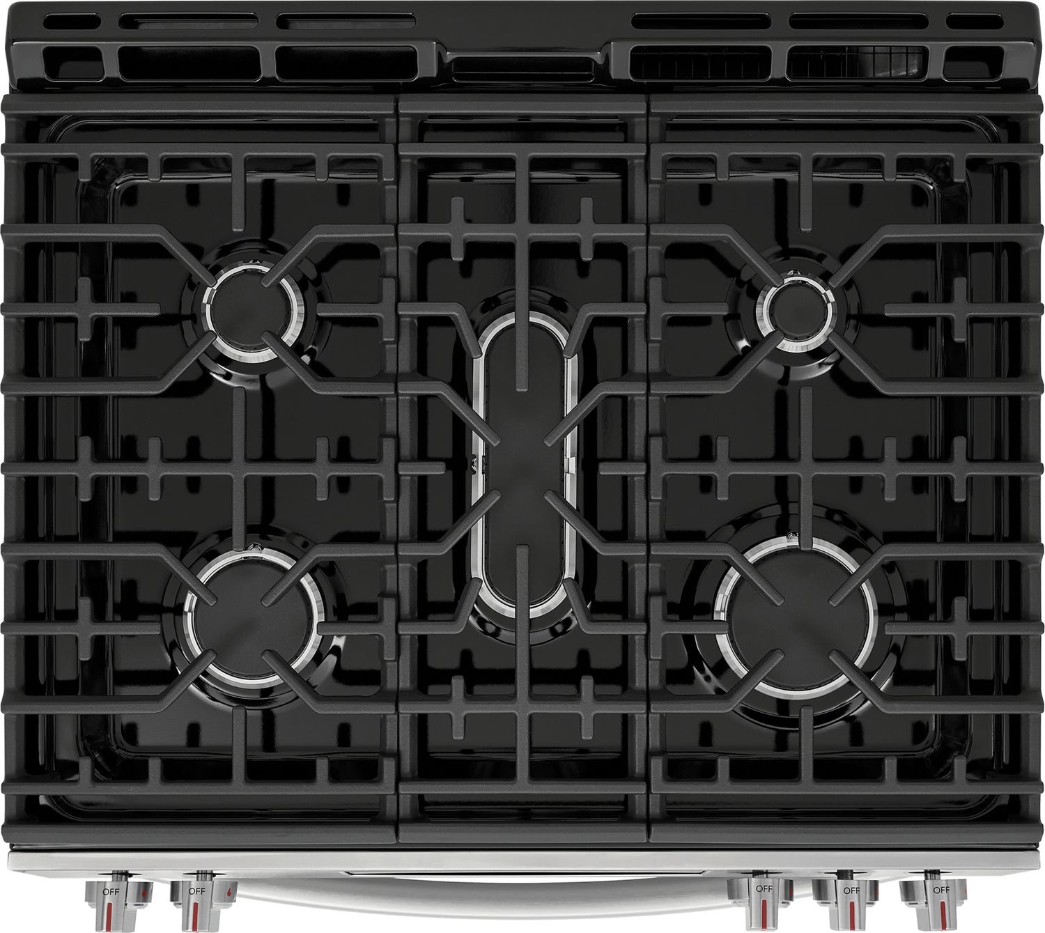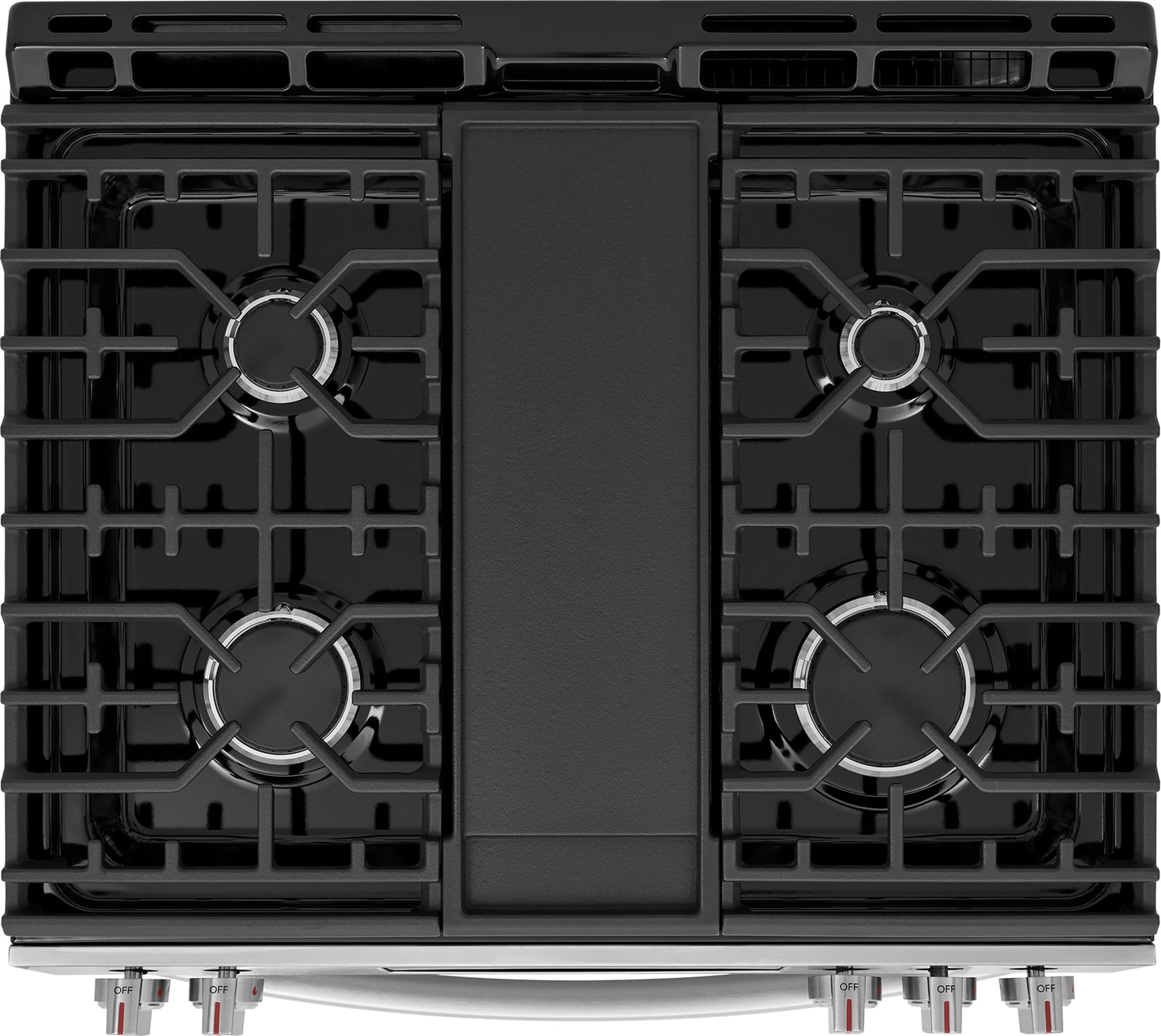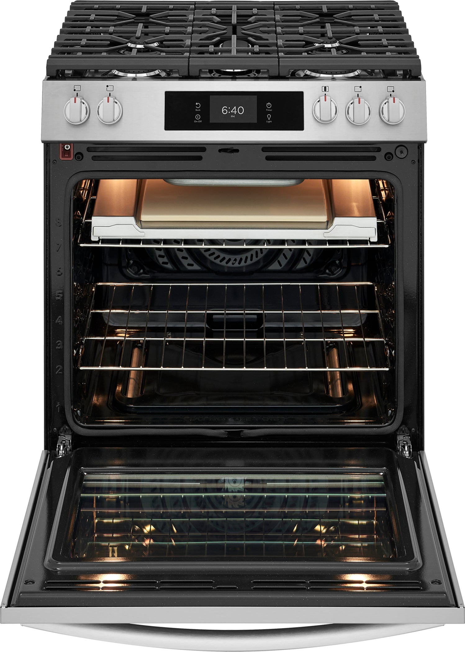 This Frigidaire Gallery gas range is the only range designed to reach temperatures of 750⁰F+, the high heat needed to create authentic restaurant-quality pizzas in as little as two minutes - right in your oven. In addition to Stone-Baked Pizza, the oven offers over 15 different ways to cook like No Preheat, Air Fry, Slow Cook, Steam Bake, Steam Roast, Air Sous Vide, Convection Roast, Convection Bake, Bread Proof and more! Plus, the flexible five-burner cooktop includes a powerful 18,000 BTU Burner and a center oval burner with an integrated cast iron griddle.
