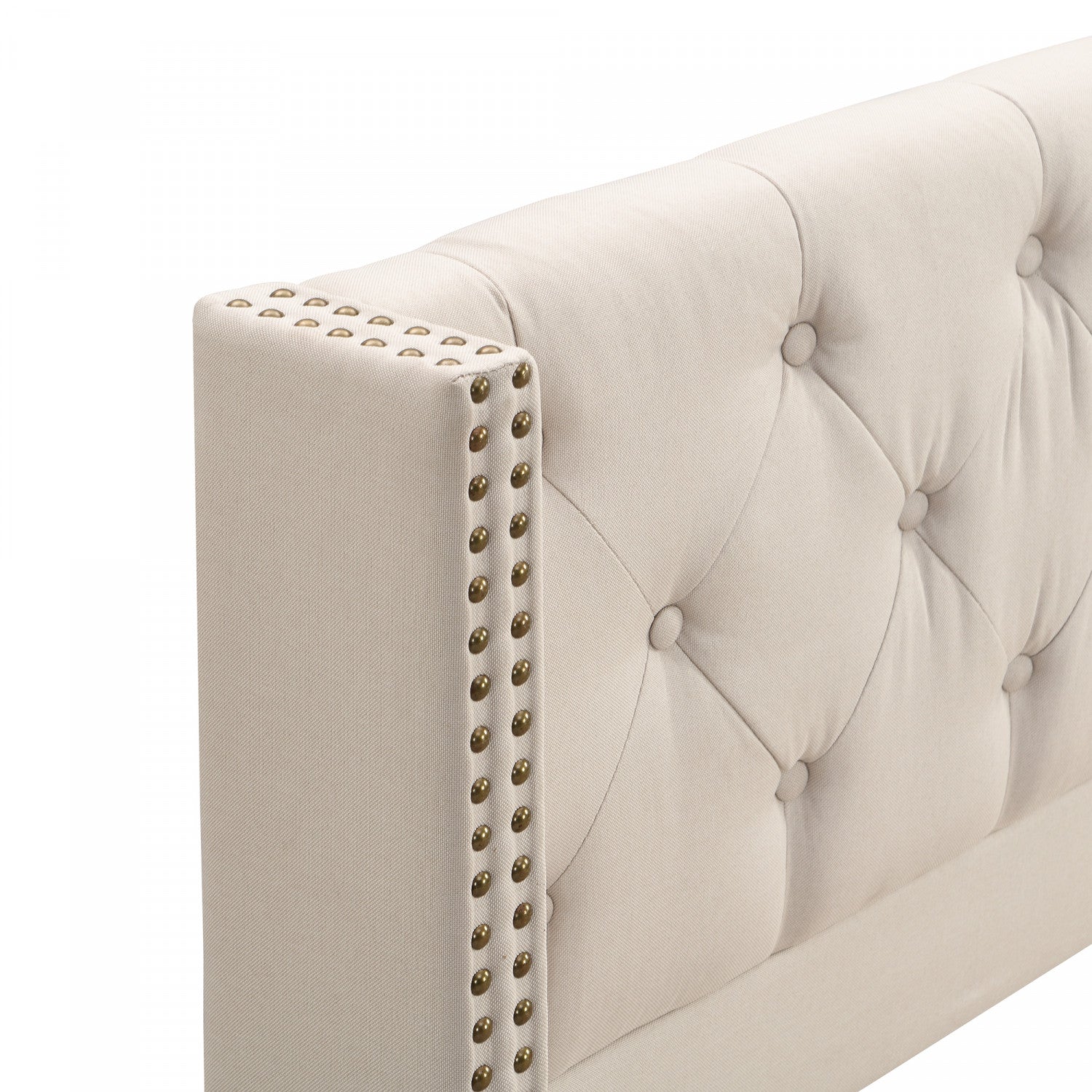 The linen upholstered platform bed combines timeless style and comfort with its classic wingback headboard, diamond tufted upholstery, and luxurious gold nailhead trim. The plush linen headboard provides ample support for lounging and reading, while the sturdy wooden legs offer a solid foundation for durability. Perfect for any bedroom, this bed merges elegance with functionality, creating a cozy and sophisticated sleep space.