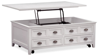 Bring home beach living with the coastal-inspired beauty of this Heron Cove coffee table. This charming piece features a fresh, clean chalk white finish accented with aged pewter drawer pulls. No matter your home decor style, its classic lines and neutral finish are sure to coordinate. Plus, this table features drawer storage and a lift-top option that adds an element of effortless versatile elegance. From modern farmhouse to cottage and transitional styles, this easygoing piece creates a memorable space.
