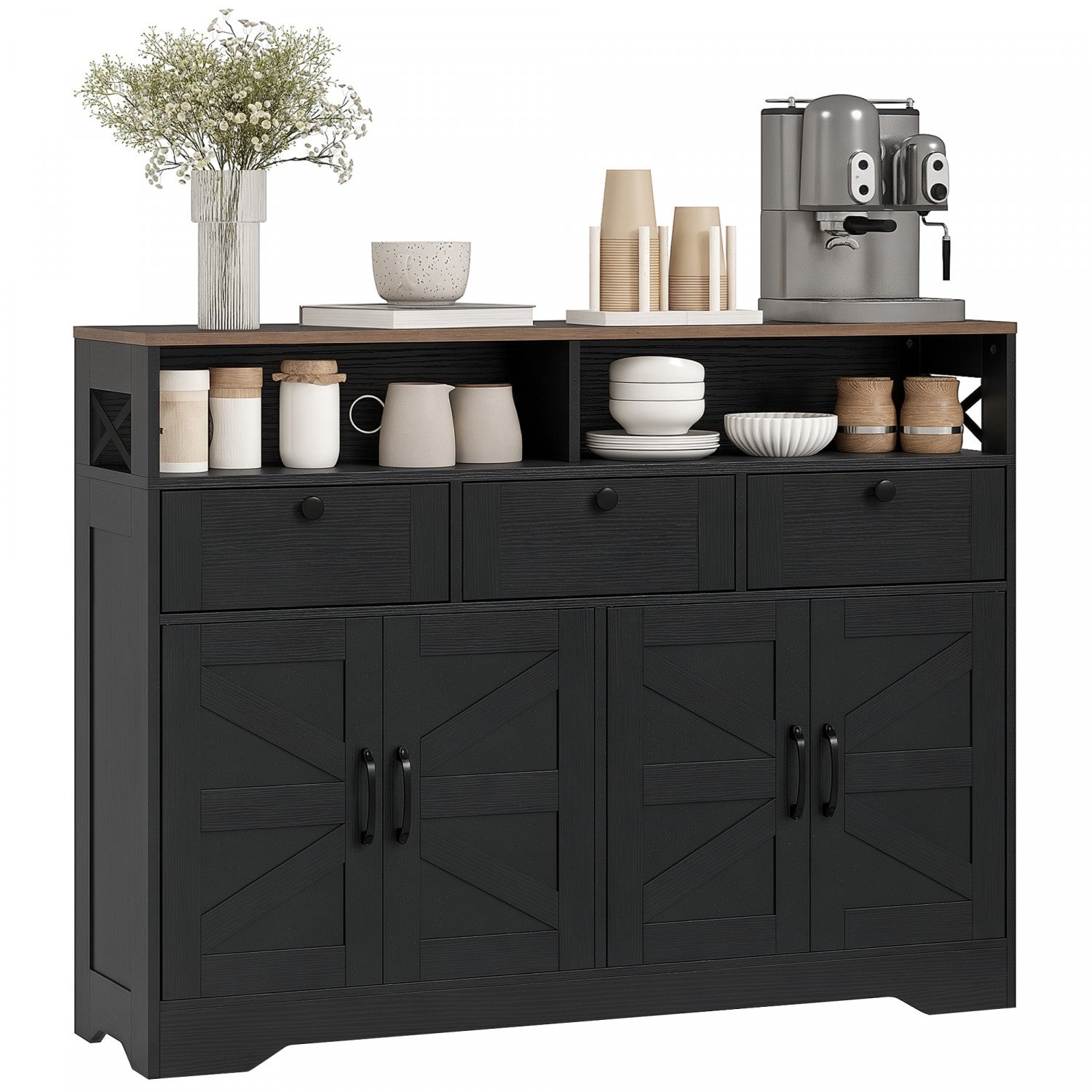 HOMCOM Sideboard, Buffet Cabinet with 4 Barn Doors and 3 Drawers Black