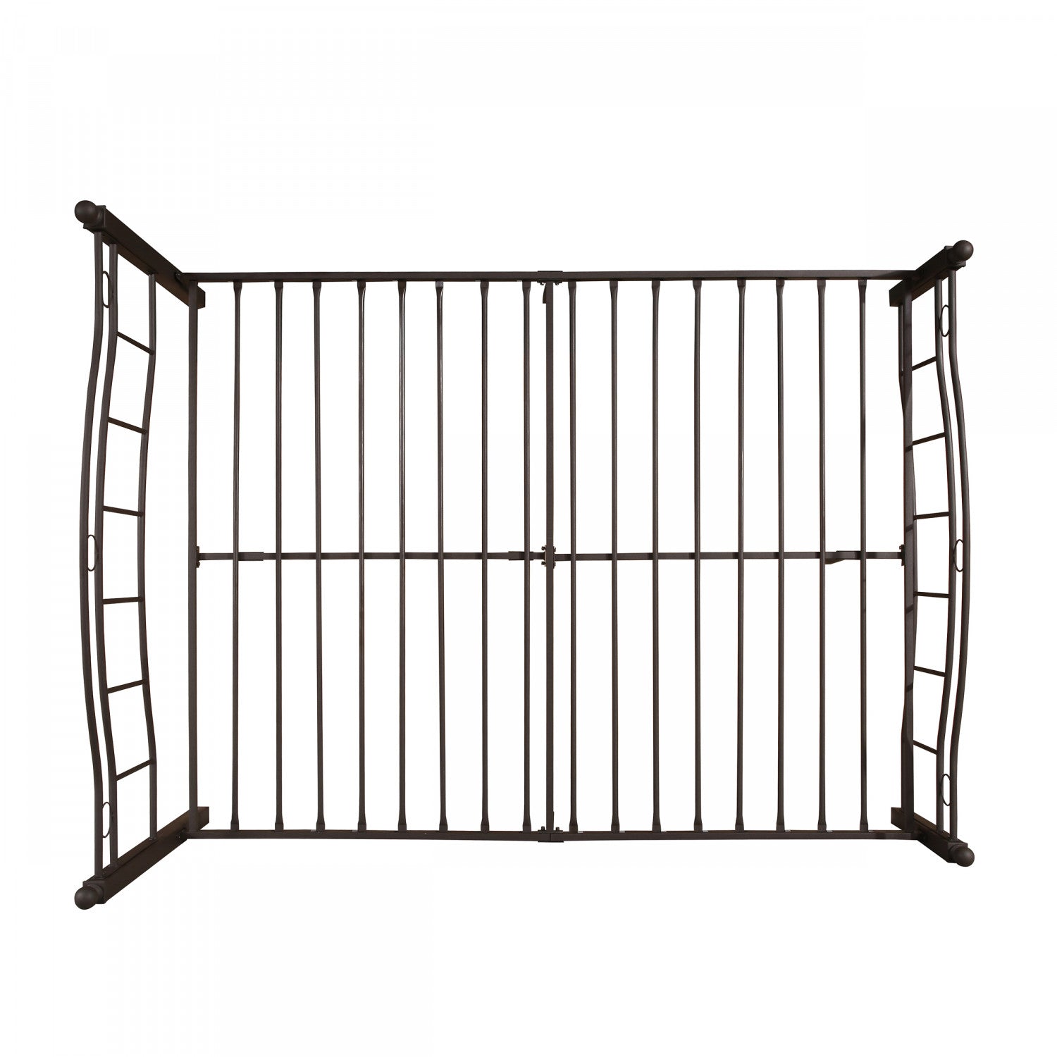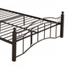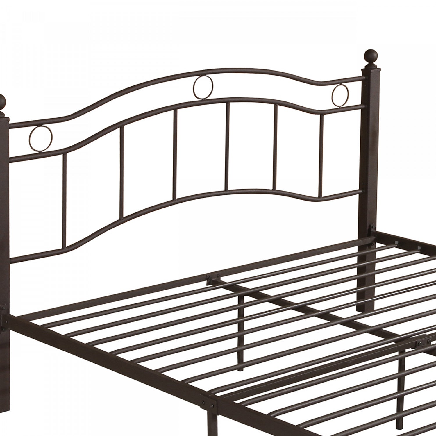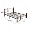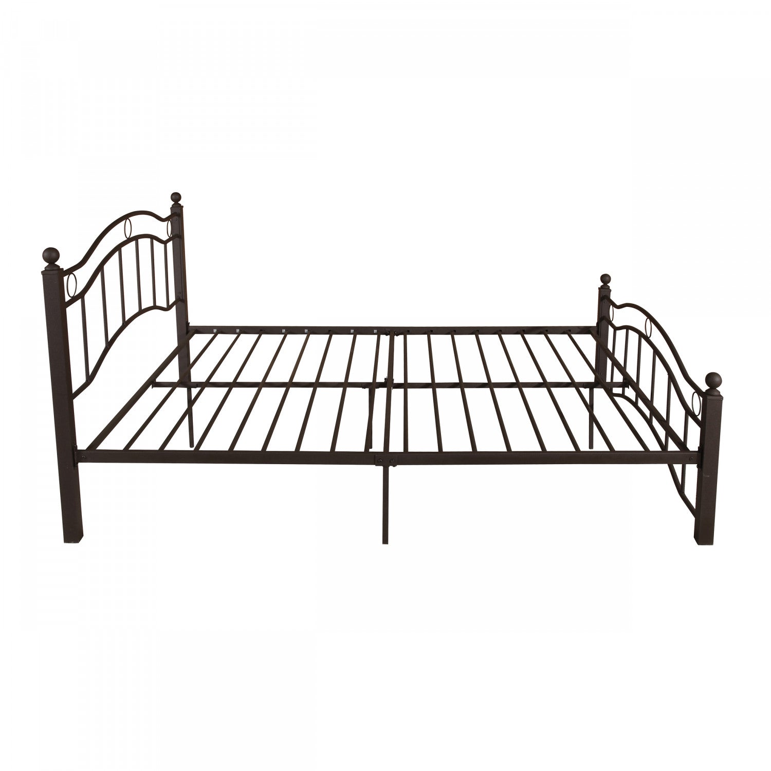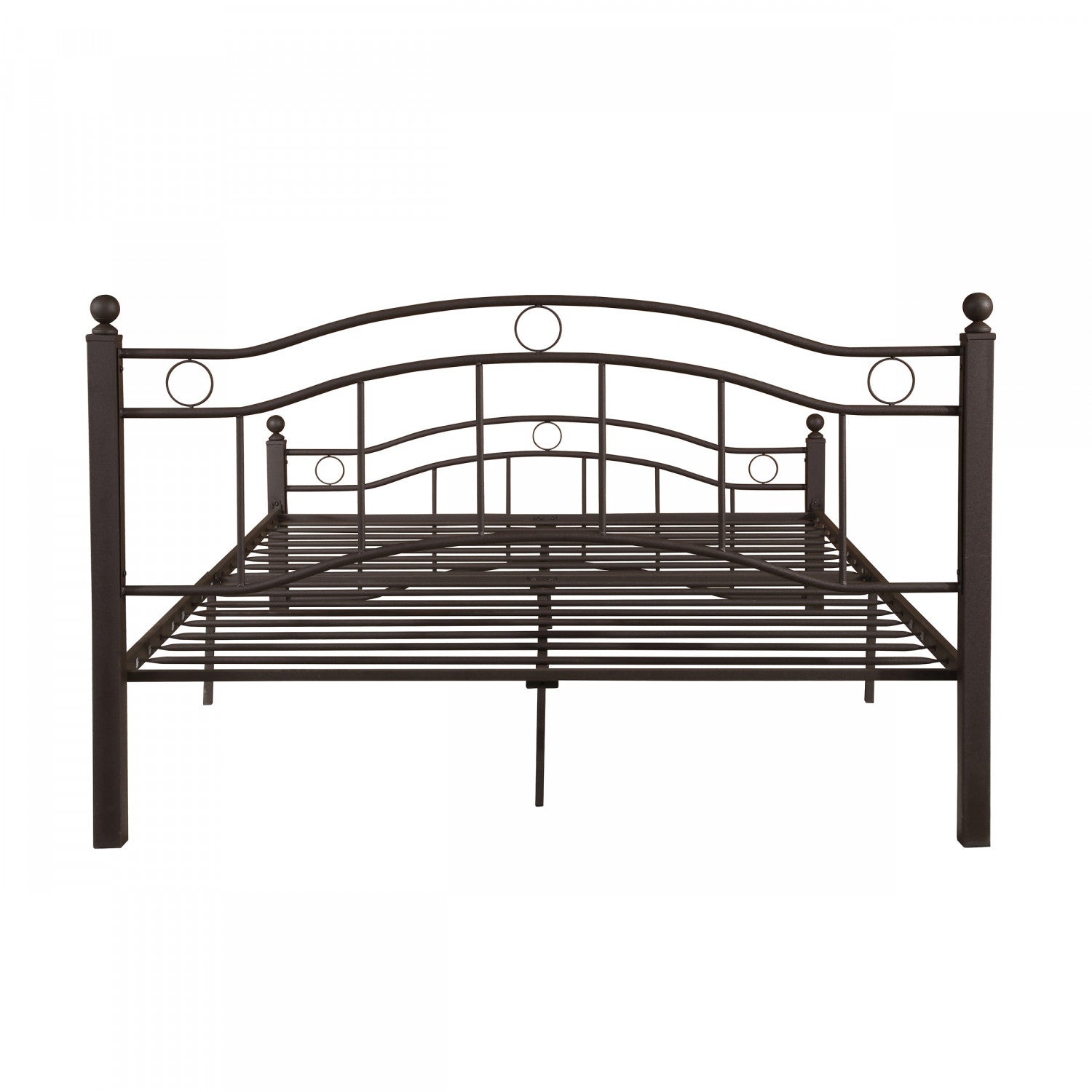 The king size metal bed frame combines durability, style, and practicality for your bedroom. Crafted from sturdy iron, this frame supports up to 800 lbs. With its strong slats, eliminating the need for a box spring. The unique headboard with wave design, vertical lines, and circle details adds a timeless touch, while the matching footboard enhances elegance and safety. With 11. 8" of clearance, it offers generous underbed storage for clothes, quilts, or boxes. Easy to assemble, this bed frame is both functional and stylish.
