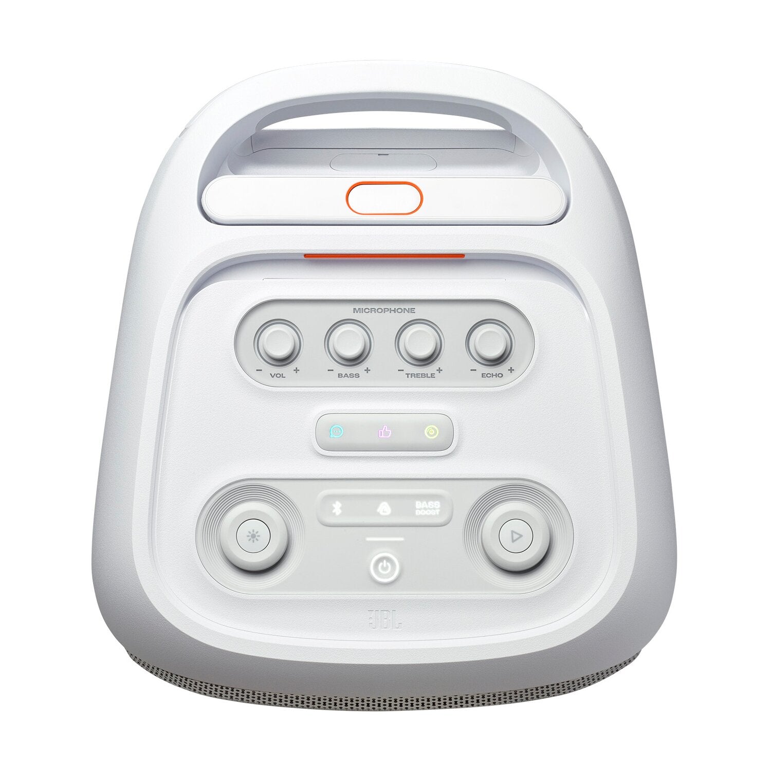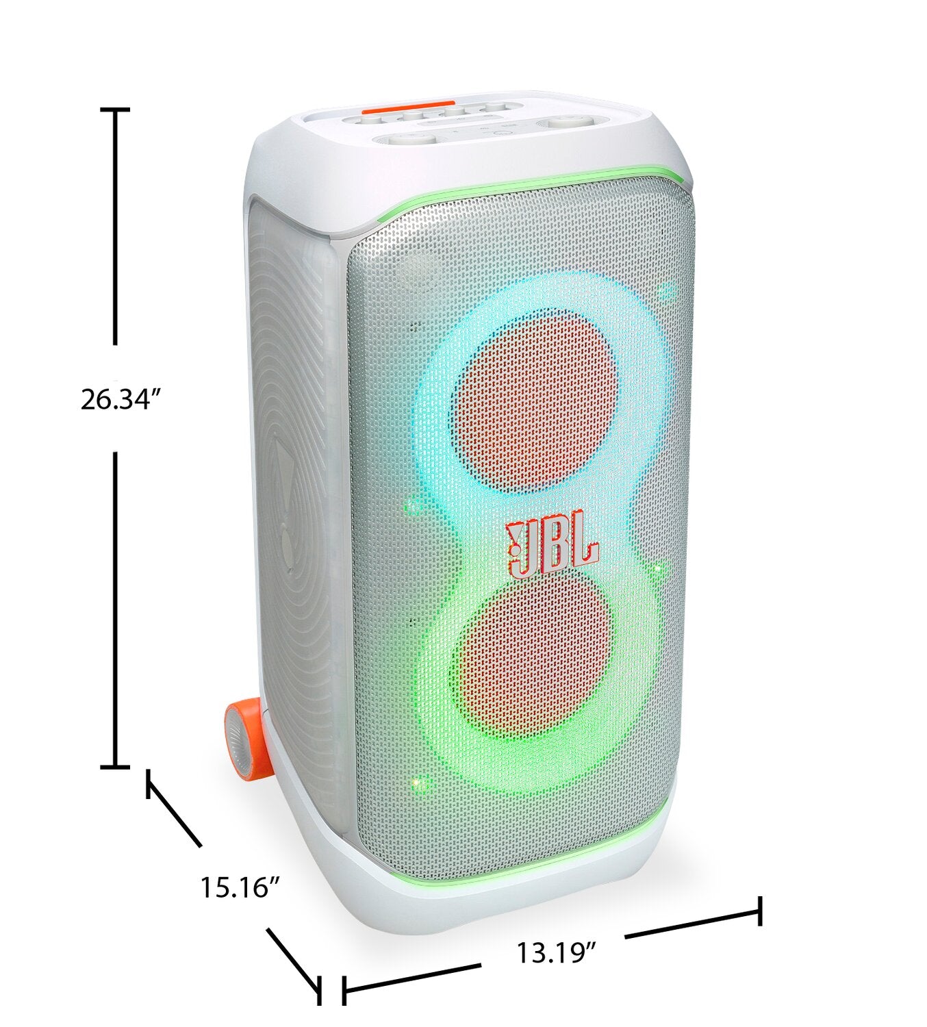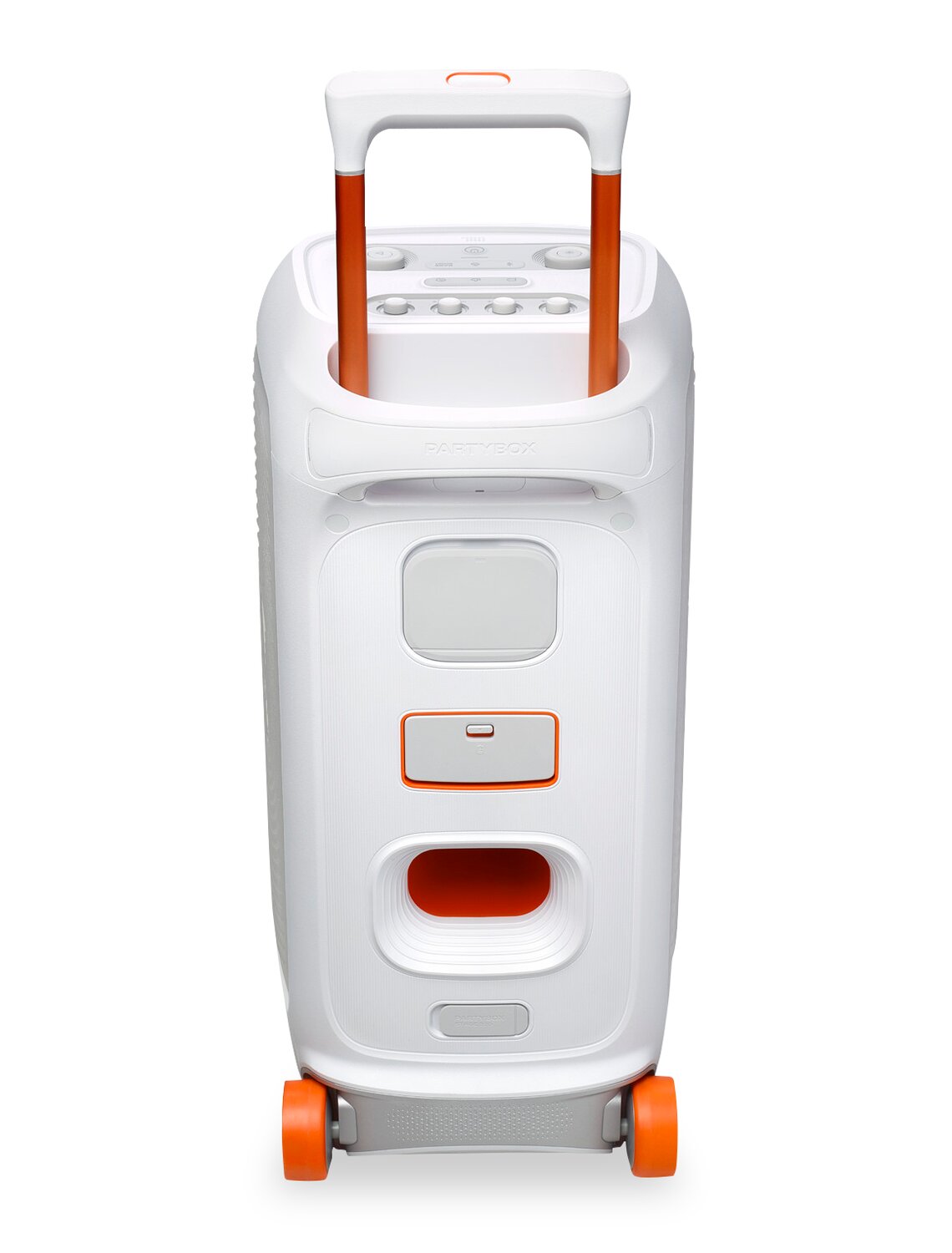 Powerful JBL Pro Sound: Up to 18 Hours of Play Time: Telescopic Handle and Wide, Sturdy Wheels: Futuristic Lightshow: Splash Proof: AI Sound Boost: Dual Mic and Guitar Inputs: JBL PartyBox App:  |