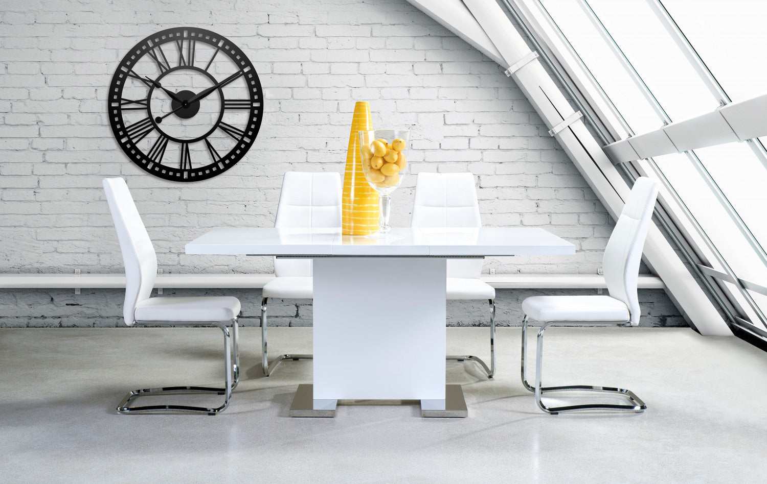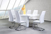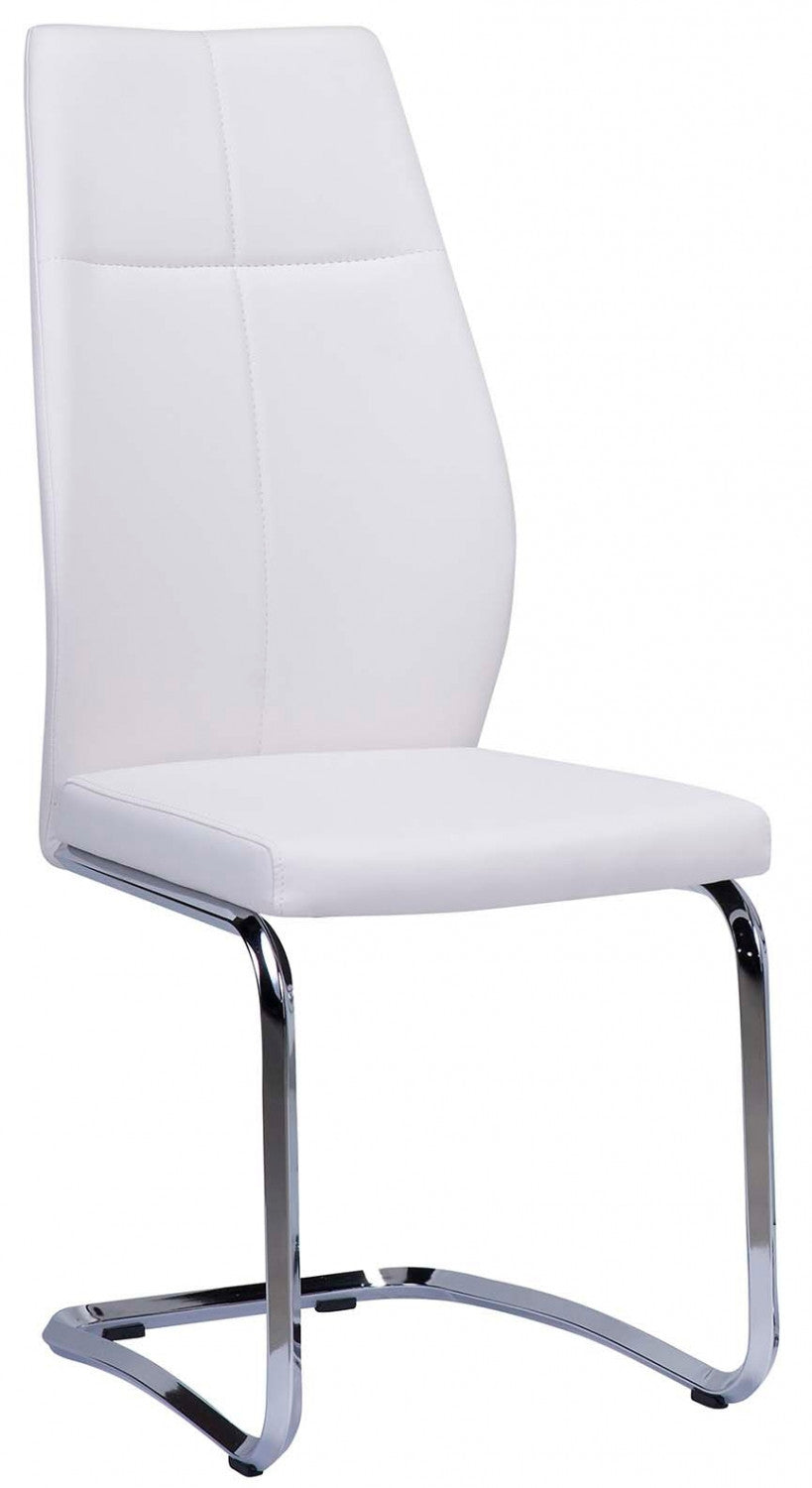Float beside your dining table with the fabulous Julius Dining Chair. A continuous curved chrome-finished base supports the foam-padded back and seat cushion. The stylish design features a chic profile, a tall back with stitch accenting, and a soft white faux leather covering that is both supple and easy to clean. Ideal for any modern dining room, the Julius pairs well with a variety of modern, contemporary, and glam dining tables.