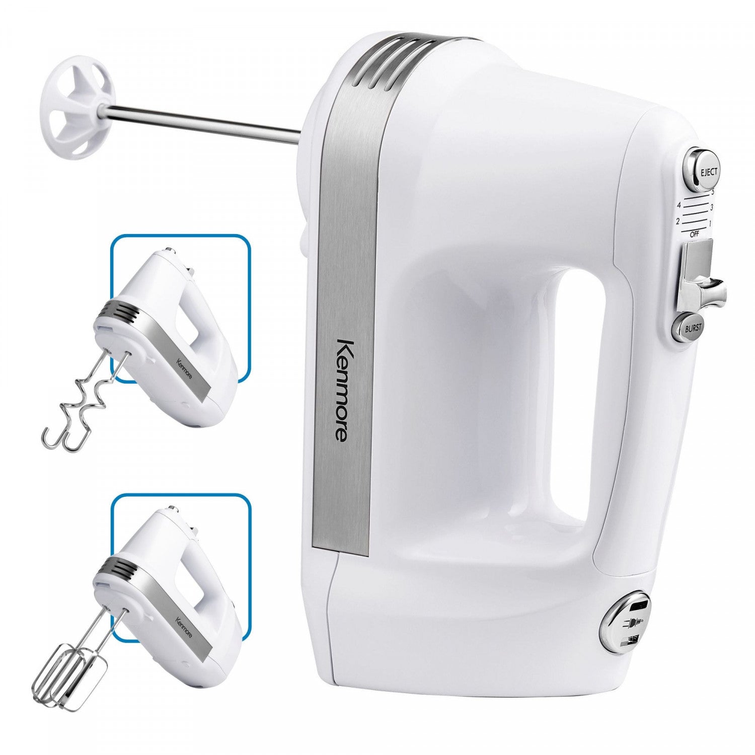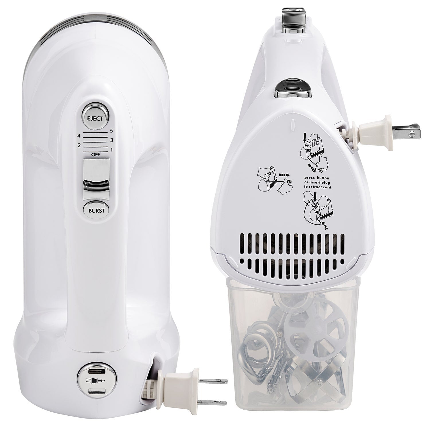The Kenmore 5-Speed Hand Mixer / Beater / Blender is the perfect tool for the home baker. From whipping cream for dessert to whipping up a batch of chocolate chip cookies, this 250 Watt hand mixer has the power and accessories you need to tackle everyday jobs without pulling out your big stand mixer. This versatile hand mixer features 250 watts of power with burst control to give you an extra boost when you need it. This uniquely designed system includes interchangeable beaters, dough hooks, and a liquid blending rod to suit all your mixing needs, plus automatic power cord retraction and a clip-on accessory case for convenient all-in-one storage so you can mix it fast and mix it right!