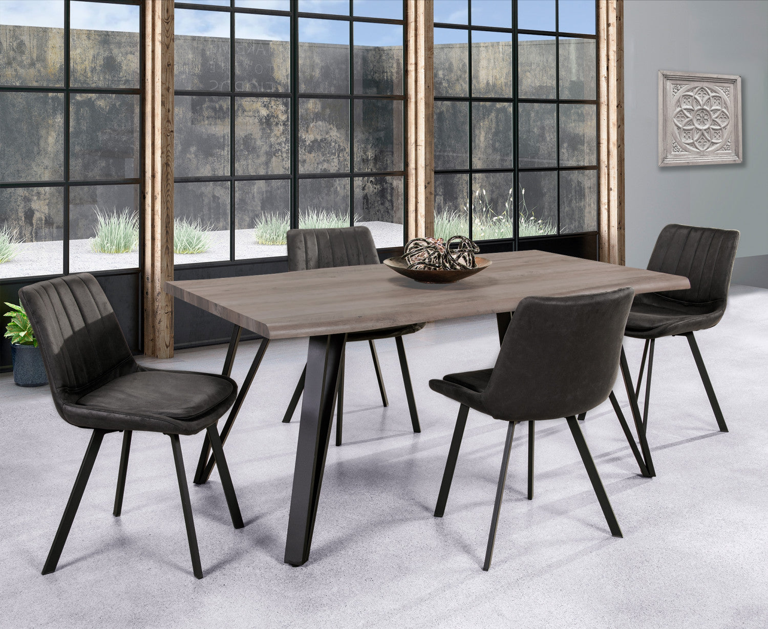 The industrial-chic design of the Kerri Dining Chair is an excellent choice to enhance your dining room without sacrificing comfort. Soft charcoal faux leather upholstery moulds to the body's shape over a sturdy frame. Foam cushioning for extra padding, channel stitching for visual flair, and angled black metal legs complete this fetching seat design, perfect for a variety of dining table styles.