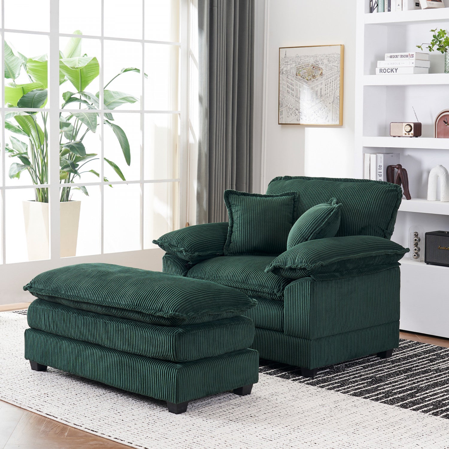 The Extra-Large Reclining Cloud Sofa delivers modern comfort and versatile style for living rooms, apartments, and offices. Upholstered in soft corduroy, it offers a cozy texture with excellent breathability and durability. The double-layered seat cushion combines foam and spring support for a plush, cloud-like seating experience. Designed for single-person relaxation, it includes two soft cushions and a movable ottoman that adapts to your space, providing comfort for lounging, reading, or movie nights.