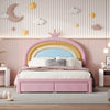 The upholstered rainbow princess bed combines playful design with practical functionality. Featuring a vibrant rainbow-inspired headboard and soft velvet upholstery, it brings cheerful style and comfort to any bedroom. The sturdy platform frame eliminates the need for a box spring, while built-in storage drawers provide a convenient place to keep bedding, clothes, or essentials neatly tucked away. Supported by durable