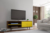 The Liberty 62.99 Mid-Century Modern TV Stand is a high quality, beautifully crafted, functional unit. Featuring two open shelves, and one large concealed compartment perfect for stashing DVDs, board games, electronics, and media accessories, this entertainment center is the ultimate gathering place and will create a statement in any space. Artful grooves mix well with any decor and splayed wooden legs add character and ease for moving. Available in white, white and rustic brown, white and aqua blue, white and yellow, rustic brown, rustic brown and white, and rustic brown and yellow.