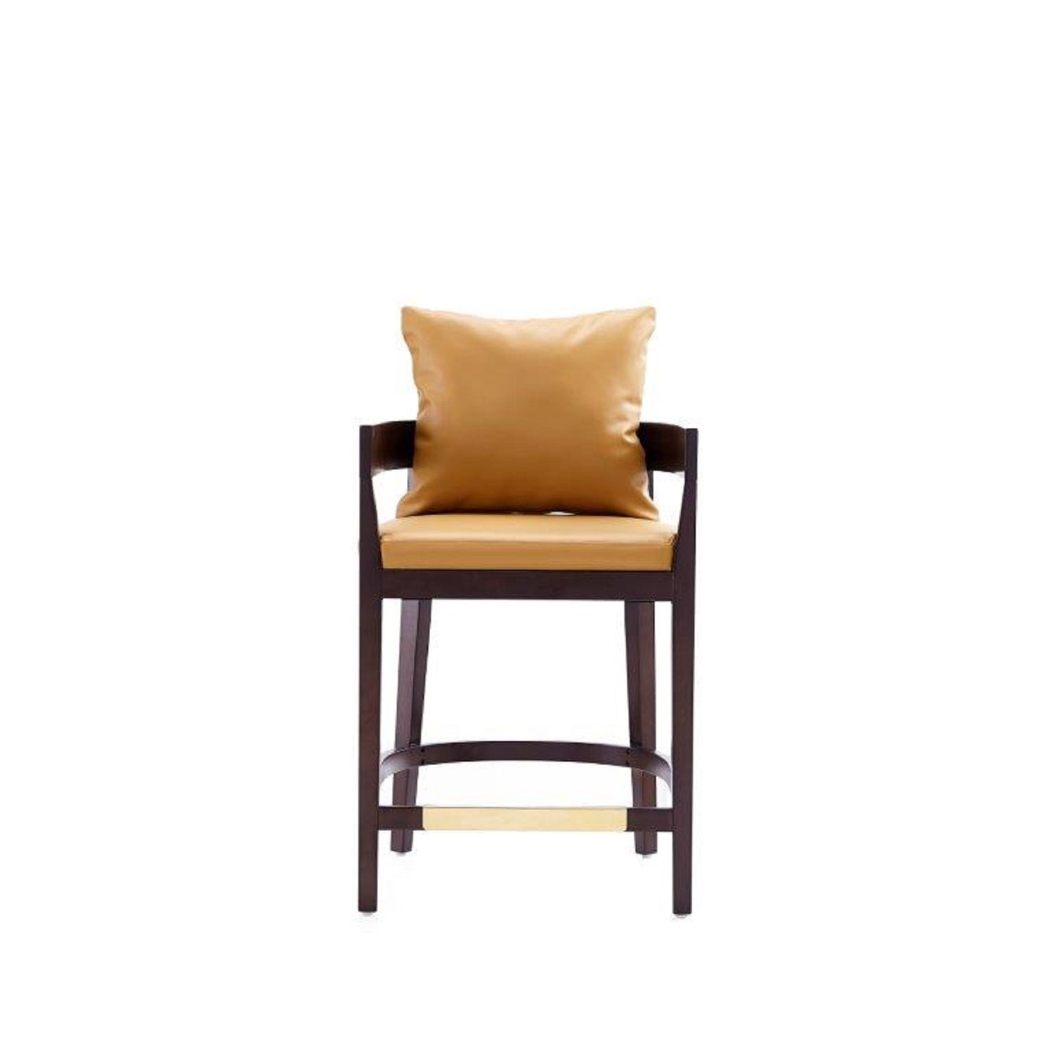 Standing on solid wood legs, this stool's wide cushioned seat and back, offers comfort and a clean-lined aesthetic to kitchen islands and bar tops. Accented with a gold finished footrest, casual comfort meets sleek and chic modern design to update or accent your home's upscale decor.