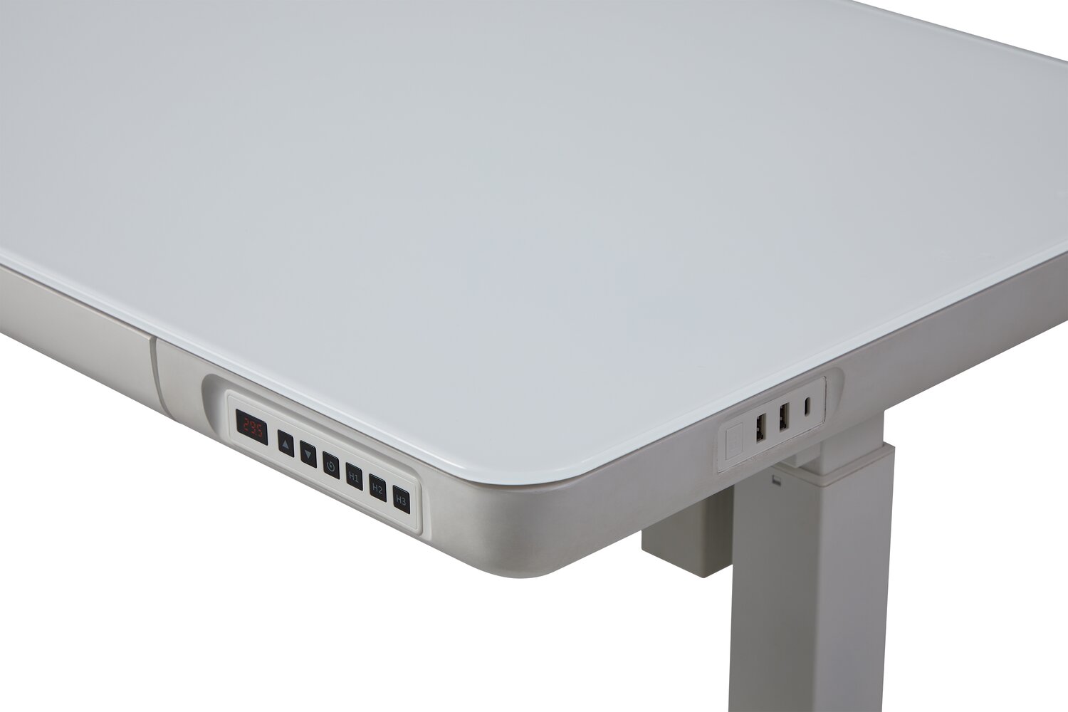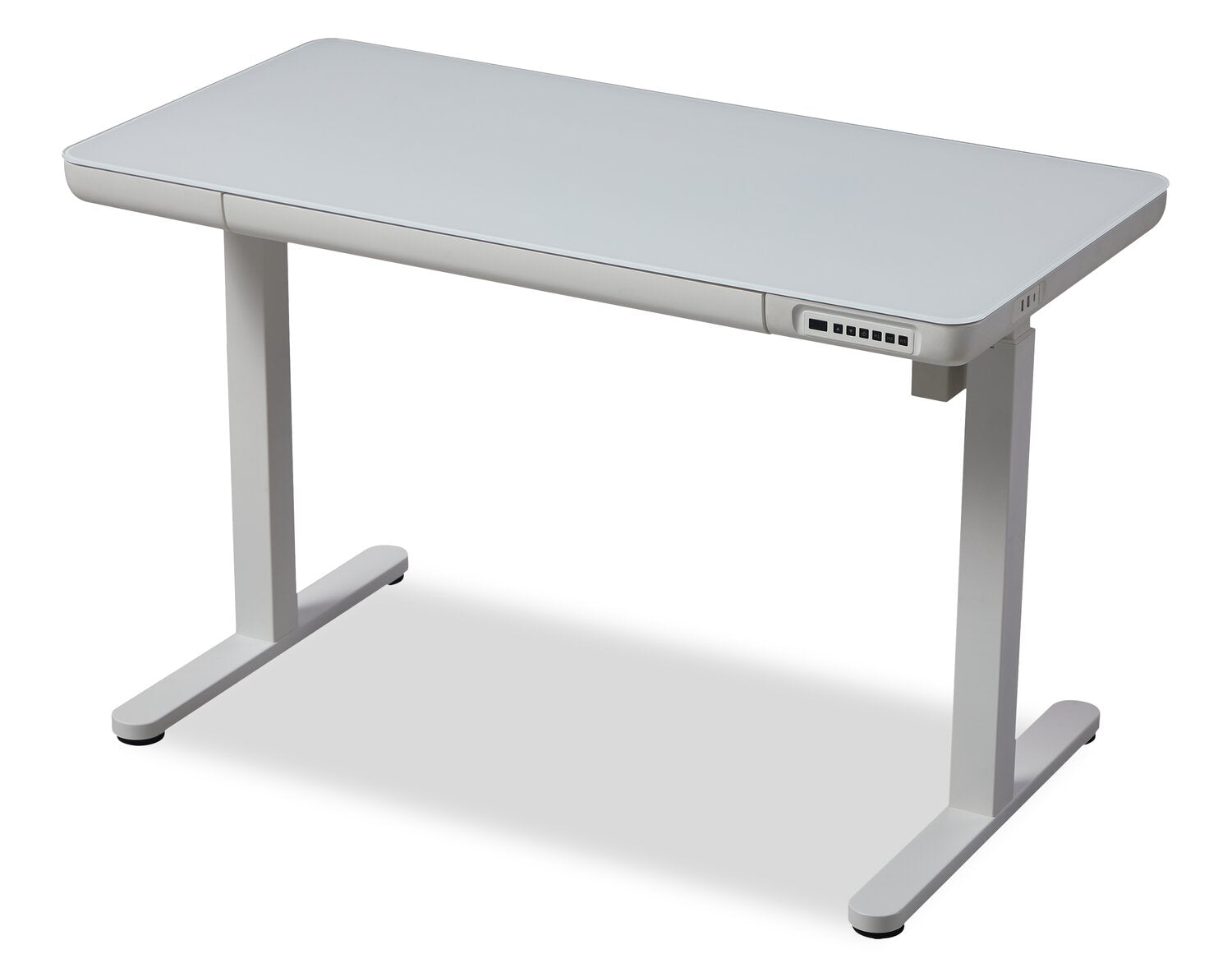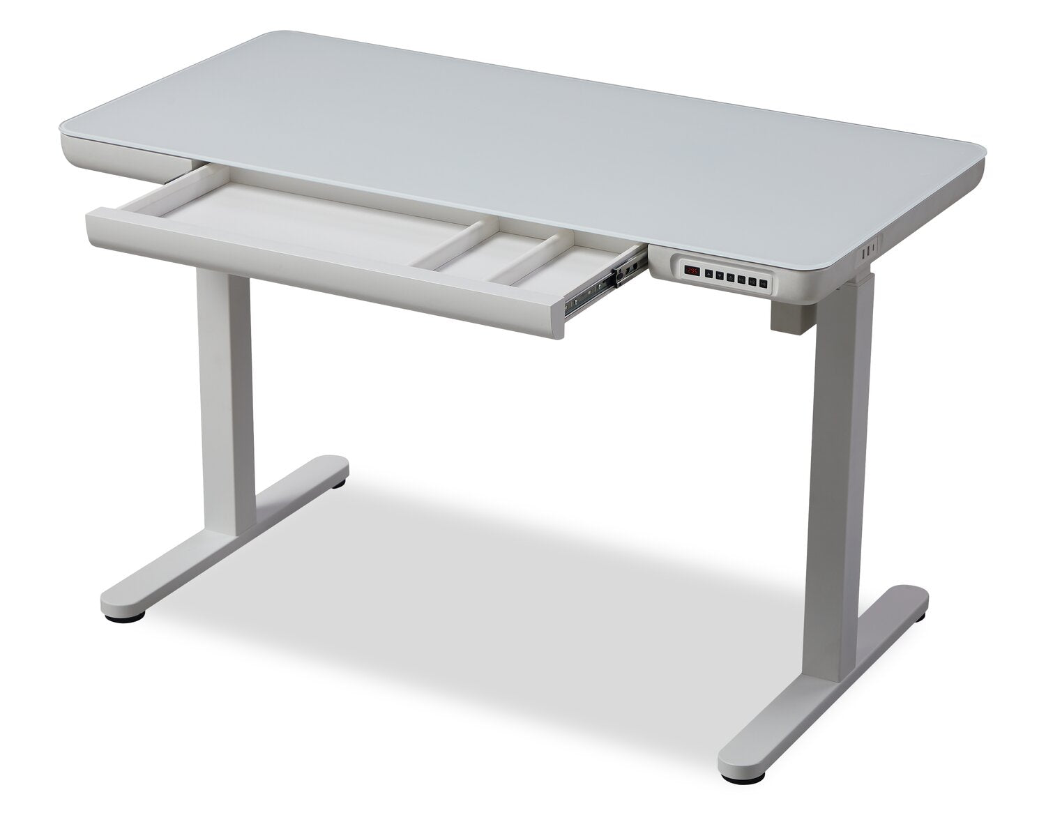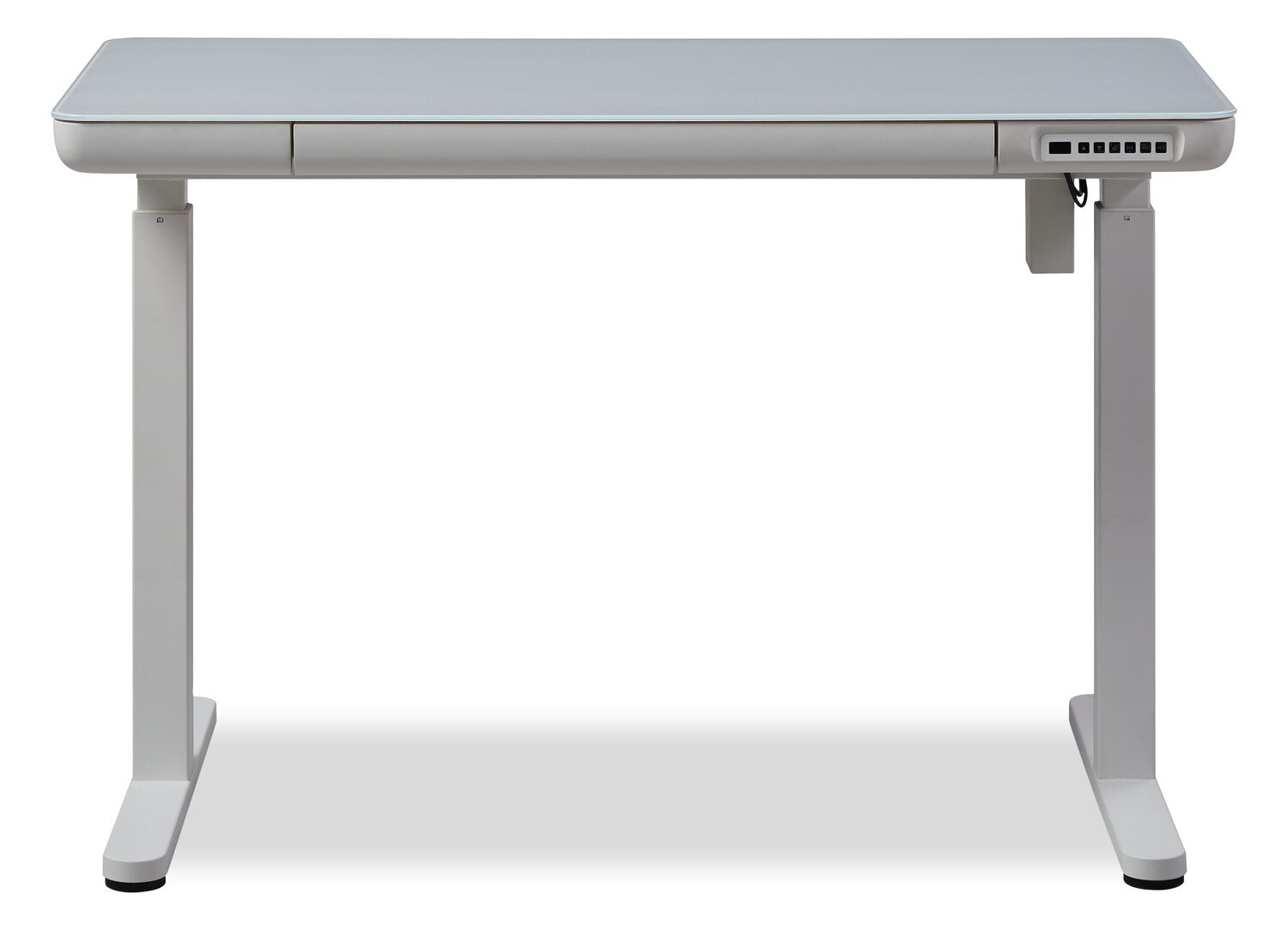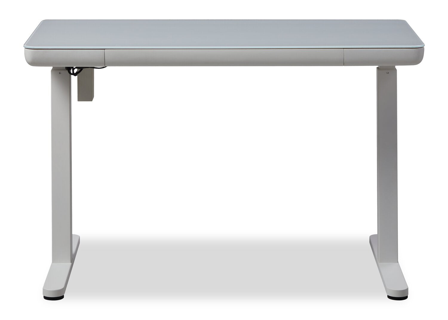 Experience ultimate convenience and efficiency in your office with this Metro height-adjustable desk. This sleek and modern desk offers multiple USB ports, keeping you fully charged throughout the day. Its pencil drawer lets you keep your keyboard, pens and notebooks close at hand, while the power lift levelling system ensures a seamless transition between sitting and standing. Plus, a glass desktop allows for easy cleaning after accidental spills. Increase productivity and streamline your workspace with the Metro.