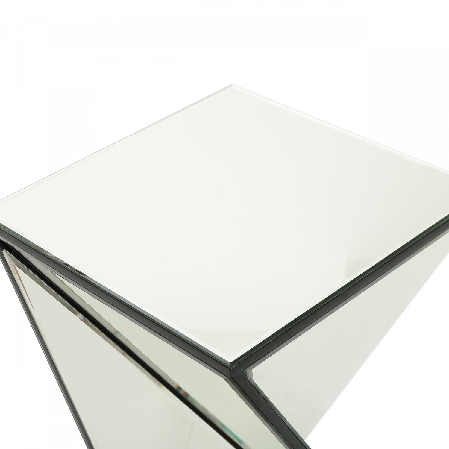 Add contemporary elegance to any space with the geometric mirrored side table. Featuring a chic, light-reflecting design with clear mirrored panels and a sculptural silhouette, this piece instantly elevates living rooms, bedrooms, or offices. Crafted from durable engineered wood and glass, it offers long-lasting style and easy maintenance. Its compact form makes it a versatile accent that fits beautifully into any modern or glam decor.