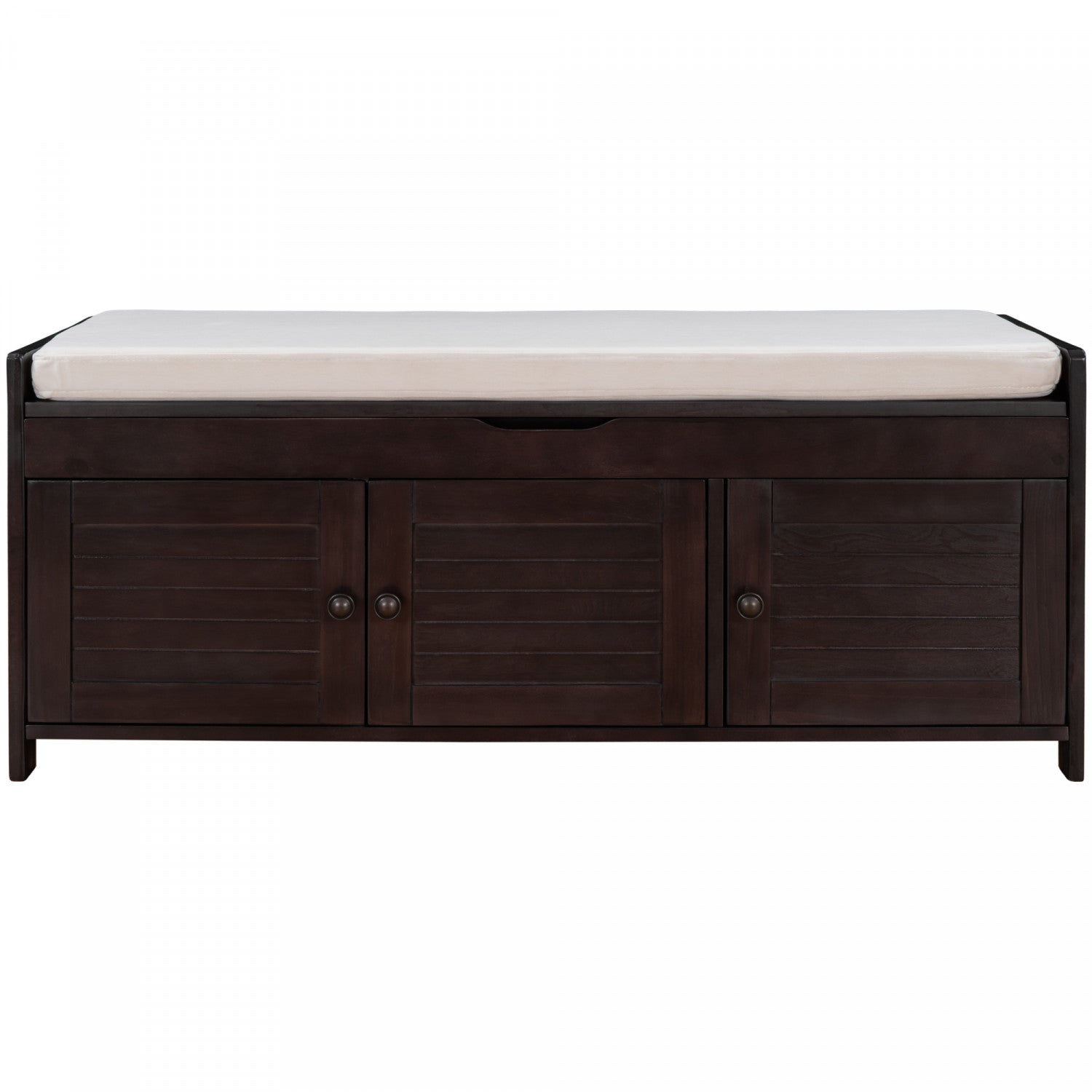 The storage bench blends rustic charm with modern functionality, offering seating, storage, and hidden space in one versatile piece. Featuring three shutter-style doors and elegant metal handles, this bench adds character to any entryway or bedroom. It offers two interior cabinets for organizing shoes and daily essentials, plus a lift-up top with hidden storage for private items. Made from mdf and pine wood, it’s sturdy enough to seat two adults comfortably. A removable cushion provides added comfort, and side handles make moving it easy.
