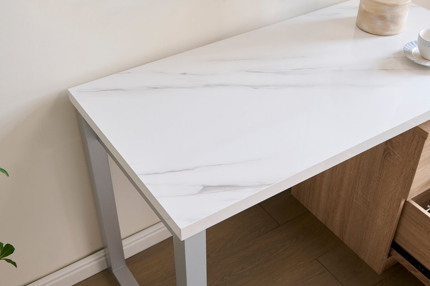 Oscar 47" Reversible Office Desk with Storage – Faux White Marble and Weathered White