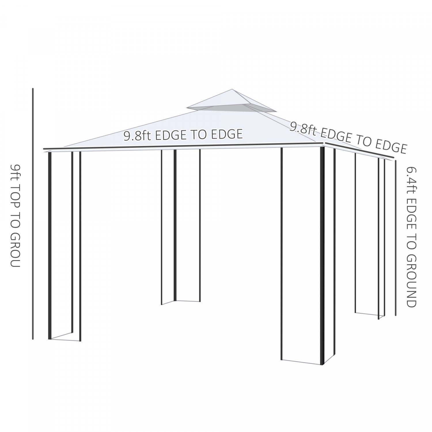 | Key Features | ● Water-resistant coated polyester fabric provides effective protection ● Two-tier canopy top provides proper ventilation and airflow to the top of your gazebo ● 9 foot tall peak is comfortable and roomy enough for your entire party to gather under ● Built-in grommets to ensure proper water drainage during rainy weather ● With a triangular shelf at each corner for displaying flower pots ● Curtains attach via plastic clips, hook and loop straps to hold them when they are pulled to be kept open ● Includes metal structure, two-tier canopy top and corner curtains in a package for your convenience ● Assembly Required |