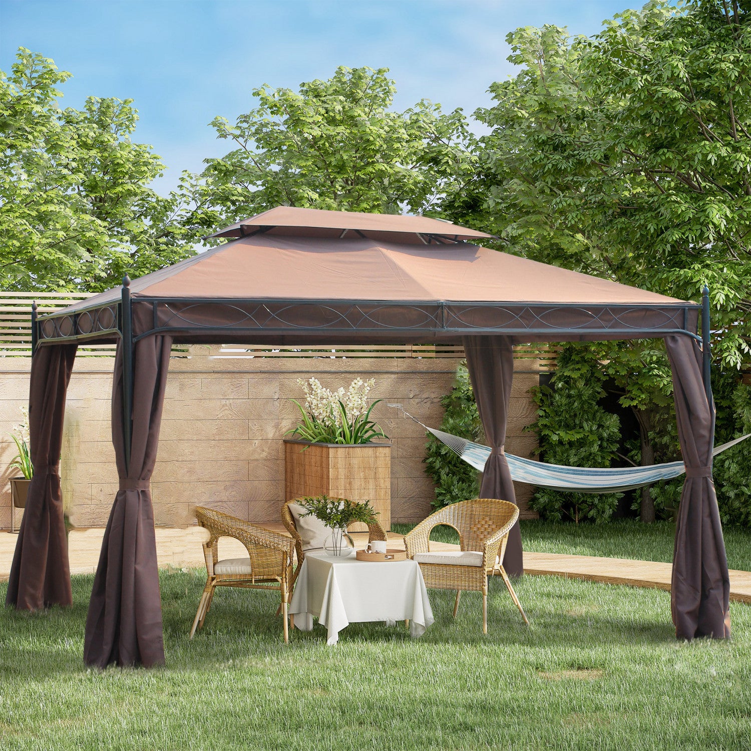 Outsunny 10x13ft Garden Gazebo Double-tiered With Curtain Outdoor Shelter Backyard Canopy Coffee
