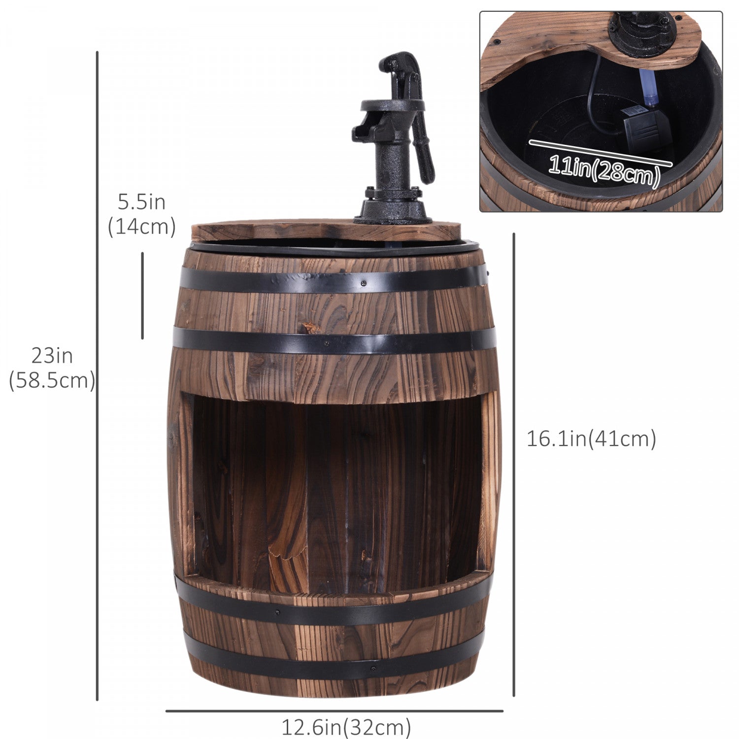 Outsunny 23" Wooden Barrel Outdoor Fountain With 3600r/min Pump Carbonized